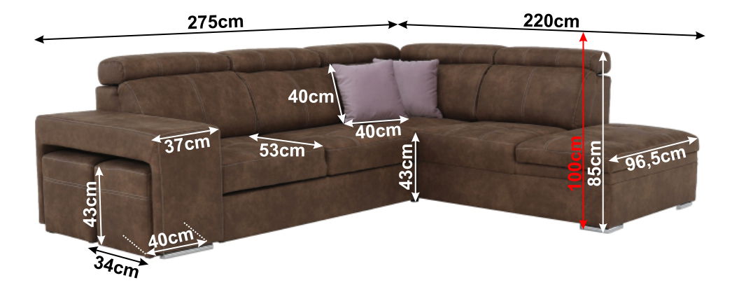 Moderna kutna garnitura Lazare dolazi s 2 taburea koja su uvučena u naslone za ruke. Mogućnost razvlačenja na površinu 120 x 190 cm. Dostupna je lijeva i desna varijanta, a boju tkanine i jastuka možete izabrati.