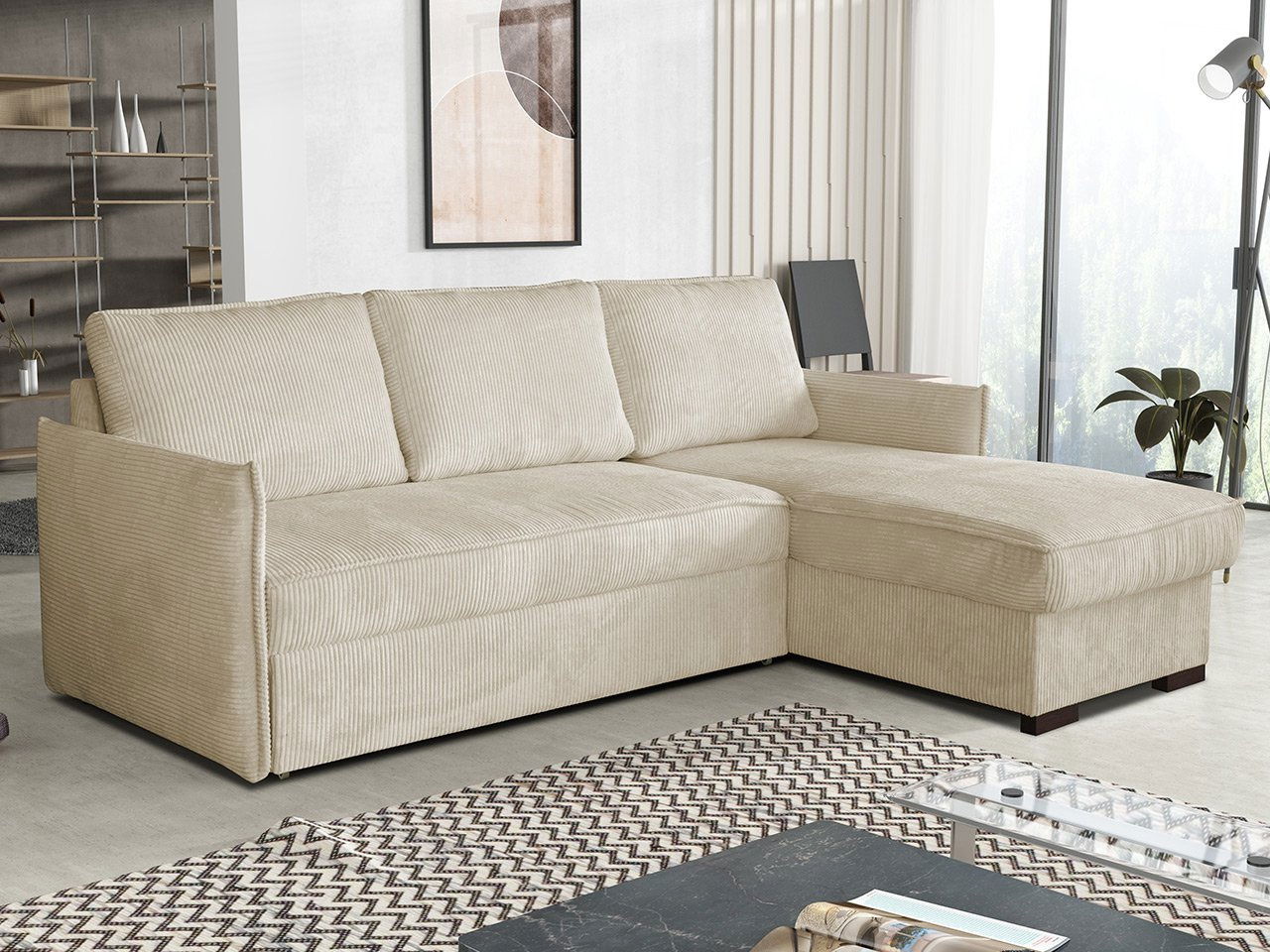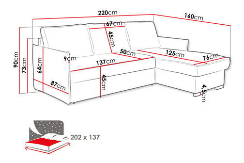 PrikazKutna garnitura idealan je izbor za one koji traže udobnost i stil. Kutna garnitura Literpo stvorena je za jedinstvenu zonu opuštanja u dnevnom boravku, sinonim je udobnosti i elegancije. Njezina ugodna presvlaka i mekano sjedište pružaju savršen prostor za popodnevni odmor. Klasičan dizajn ovog modela odlično će se uklopiti u moderne interijere. Zahvaljujući automatskom mehanizmu na razvlačenje brzo se i jednostavno pretvara u udoban krevet. Naslon, izrađen od pomičnih jastuka, može se prilagoditi individualnim potrebama, što osigurava još veći komfor. Dimenzije: duljina: 220 cm, širina: 160 cm, visina: 90 cm, površina za spavanje: 202 x 137 cm, dimenzije spremnika: duljina: 146 cm, širina: 62 cm, visina: 22 cm. Kut: univerzalan (odabir strane pri montaži). Izvedba: okvir: borovina + iverica debljine 16 mm, sjedište: pjena T30/38 debljine 10 cm + val opruge "tip A", naslon: jastuci punjeni pjenom, kutna garnitura je na razvlačenje, automatski mehanizam tipa Delfin (kolica), spremnik, drvene noge u boji wenge, naslon u obliku pomičnih jastuka, jastuci na patent, jastuci uključeni, slobodno stojeća (stražnja strana presvučena tkaninom). Jamstvo: 24 mjeseca.