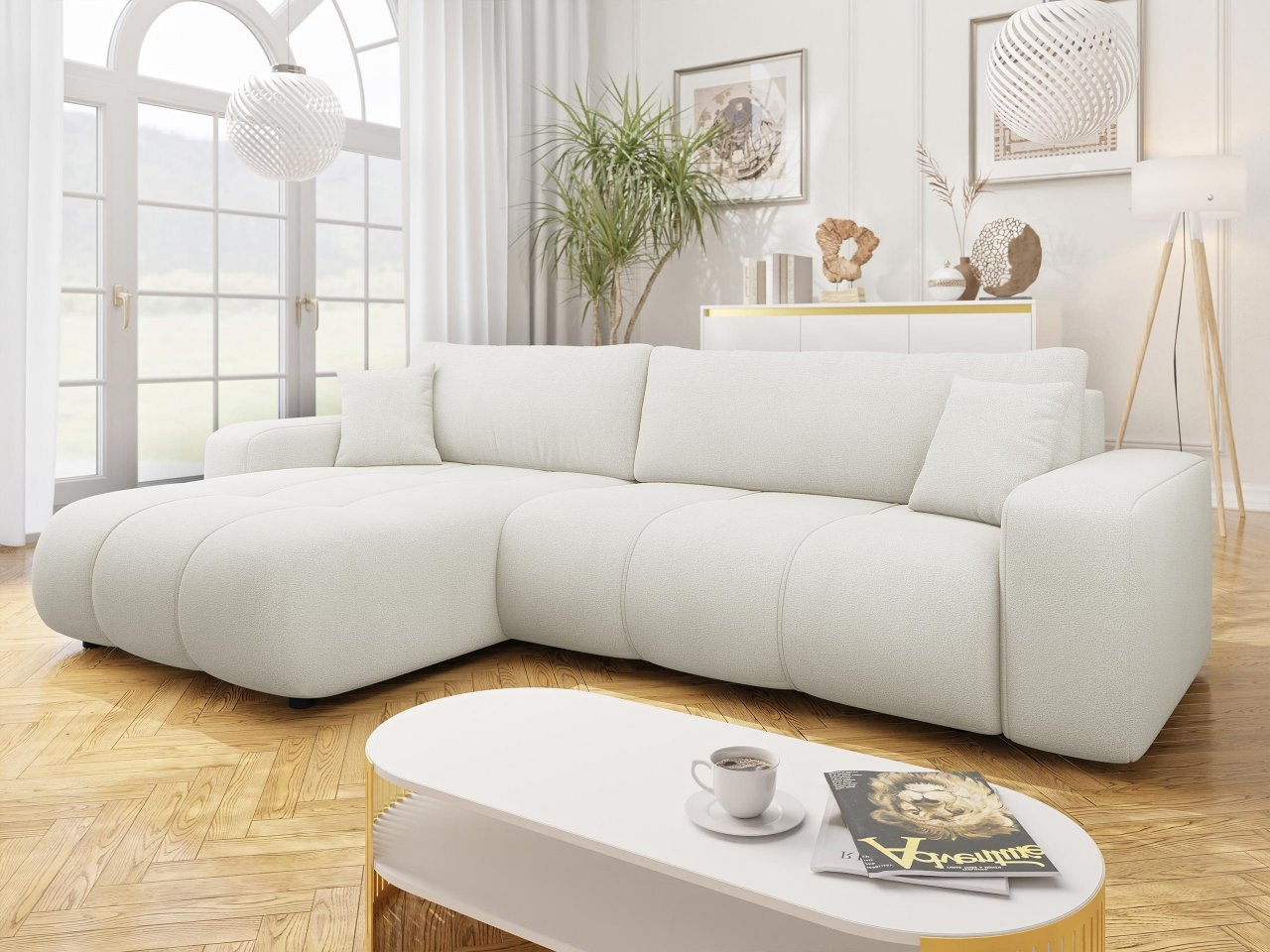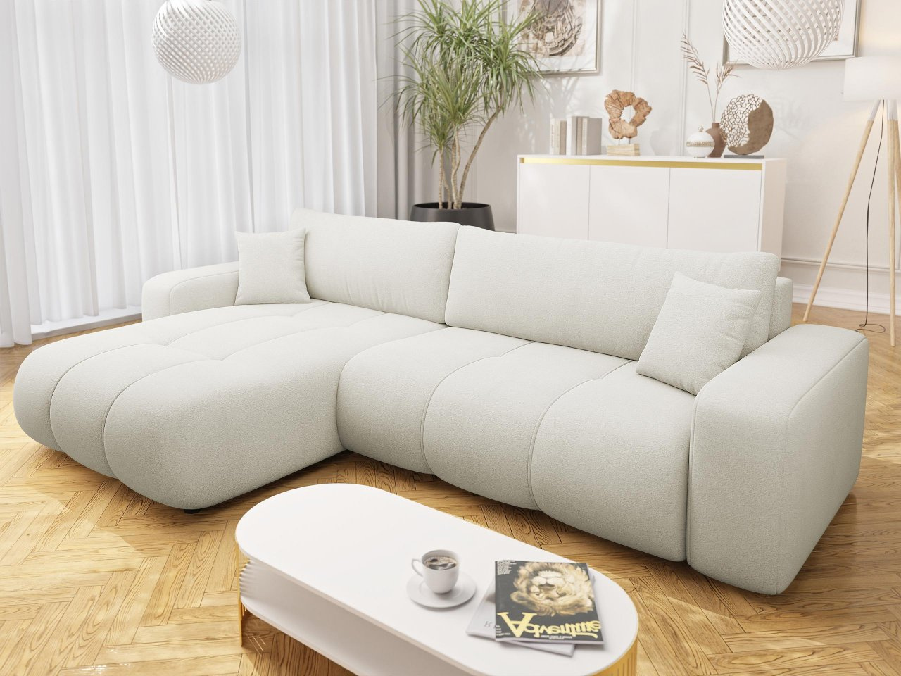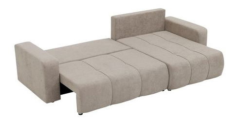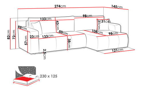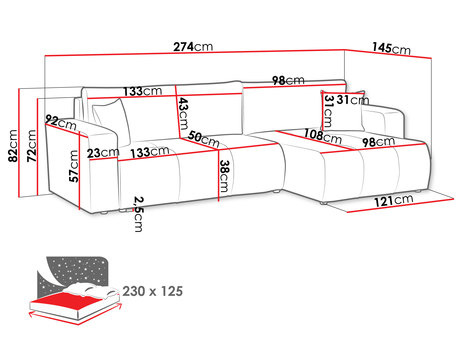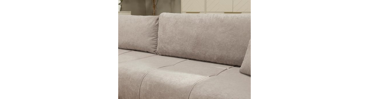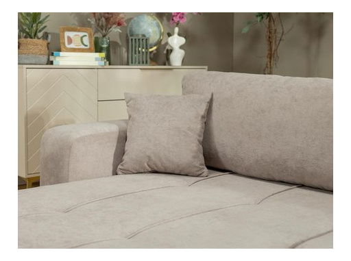 PrikazKutna garnitura je idealan izbor za one koji traže udobnost i stil. Pogledajte kutnu garnituru Larow Maxi s funkcijom spavanja i zaboravite na svakodnevne brige te si priuštite blaženi odmor na ovom udobnom modelu. Njezin izgled povezan je s oblacima. Iako nije mala, zaobljeni rubovi sjedala i naslona za ruke djeluju lagano i suptilno. Riječ je o modelu koji vam omogućuje opuštanje danju i noću. Njezina prednost je i praktičan spremnik. Kutna garnitura s prostorom za pohranu posteljine savršen je suputnik. U nju možete spremiti sezonske pokrivače, jastuke i druge dodatke za dom. Model također ima naslon u obliku pomičnih jastuka, što omogućuje prilagodbu njihovog položaja vašim potrebama. Predstavljena varijanta je samostojeća kutna garnitura. Lako ćete je prilagoditi rasporedu prostorije, a brojne opcije boja omogućit će vam jednostavno usklađivanje stila interijera. Dimenzije: širina: 274 cm, dubina: 145 cm, visina: 72–82 cm, površina za spavanje: 230 x 125 cm, spremnik: 128 x 61 x 22 cm. Kutna strana: univerzalna (kupac bira stranu prilikom montaže). Izvedba: okvir: 28 mm debelo drvo četinjača + 16 mm iverica, sjedalo i naslon: 9 cm debela pjena T30 + valovita opruga tipa A, kutna garnitura je na razvlačenje, ima funkciju spavanja, spremnik, crne PVC noge, naslon u obliku pomičnih jastuka punjenih pjenastim granulama, jastuci s patentnim zatvaračem, jastuci uključeni, samostojeća kutna garnitura (stražnji dio presvučen tkaninom). Jamstvo: 24 mjeseca.