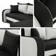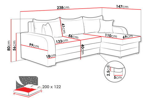 konstrukcija – masivna drvena ploča,pjena T25,funkcija razvlačenja,funkcija spavanja,s dva prostora za odlaganje,okrugle plastične noge,naslon u obliku podesivih jastuka,jastuci uključeni u set – tri velika + dva mala,jastuci na zatvarač,stražnji dio garniture je tapeciran.