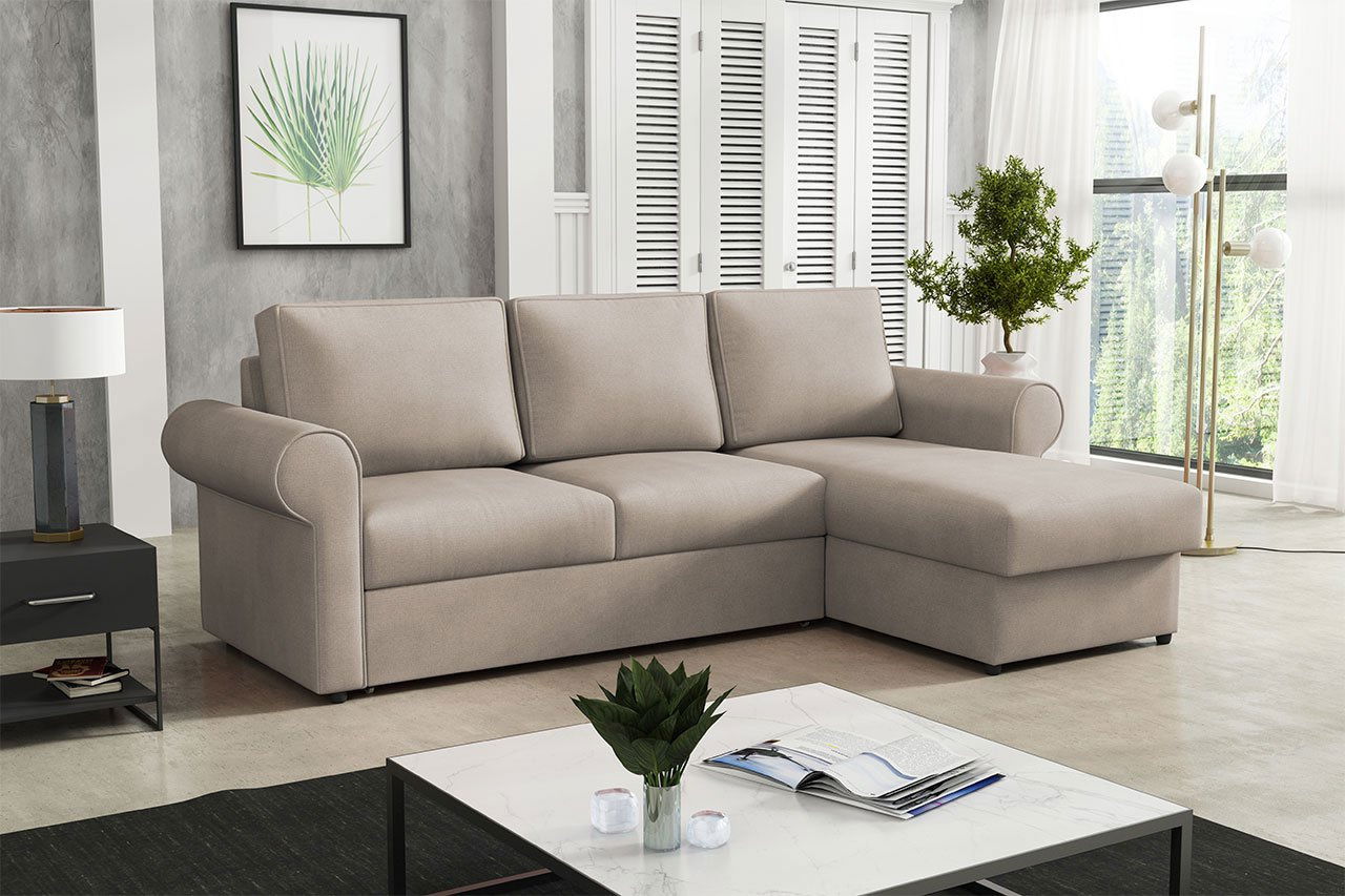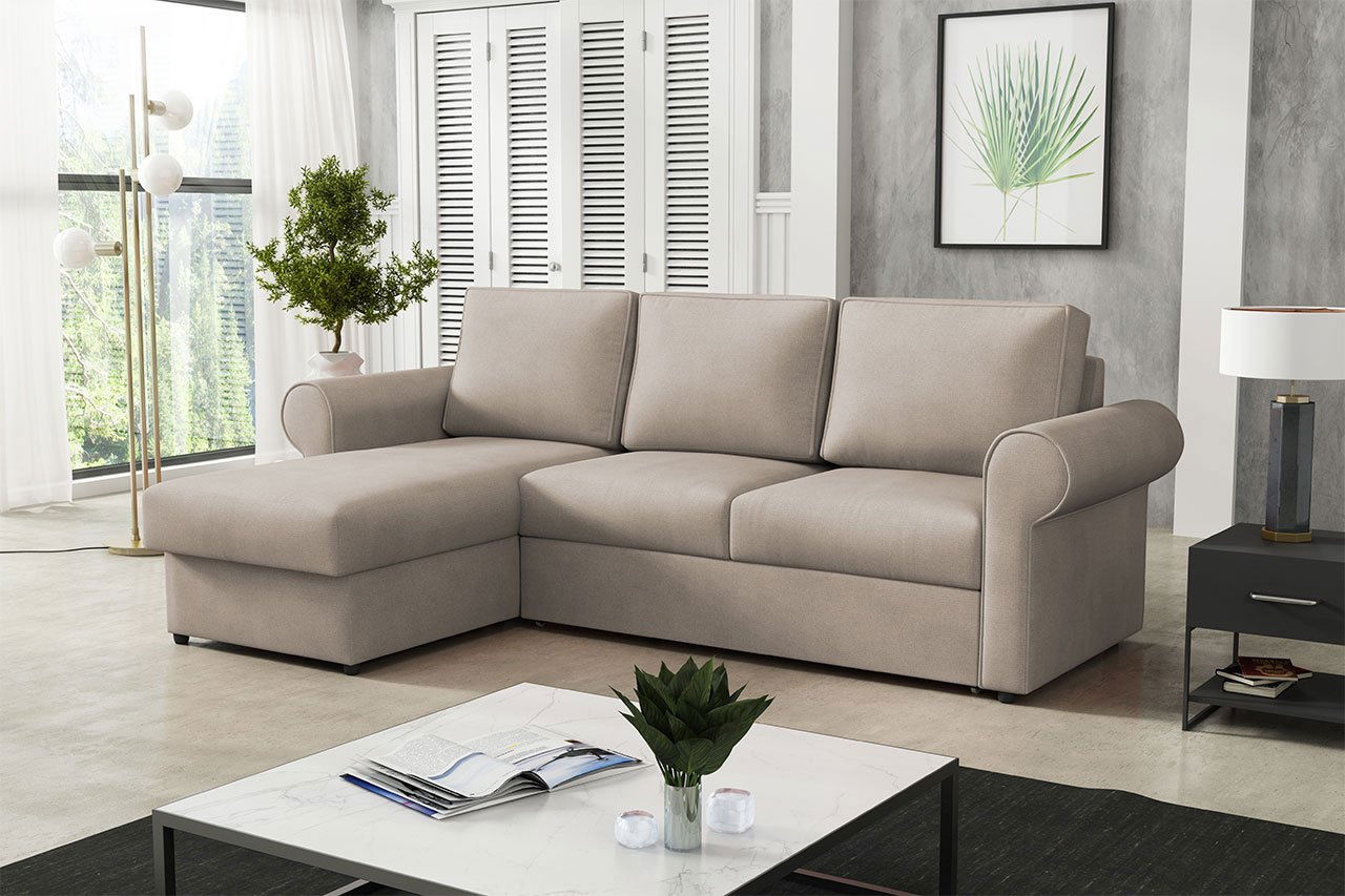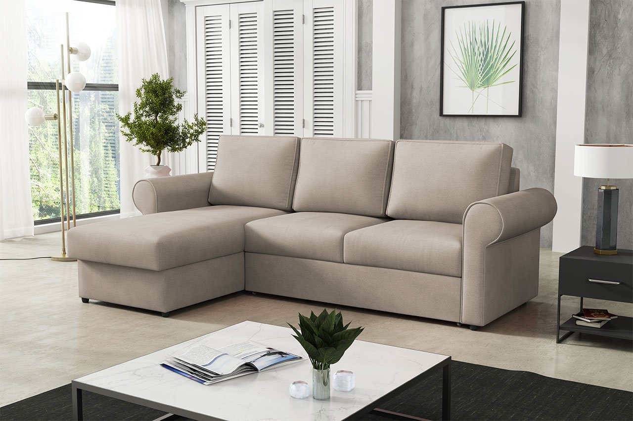 PrikazKutna garnitura je idealan izbor za one koji traže udobnost i stil. Kutna garnitura Madrid impresionira ne samo svojom udobnošću, već i elegantnim izgledom! Kutna garnitura izrađena je u obliku slova „L“ i nudi prostrano sjedište. Karakterističan element su blago zaobljeni nasloni za ruke koji garnituri daju elegantan izgled! Korištena pjena i kvalitetne komponente odgovorne su za udobno korištenje. Kutna garnitura dodatno ima funkciju spavanja i spremnik za posteljinu. Rasklapanje garniture je jednostavno i brzo zahvaljujući automatskim mehanizmima. U setu su i jastuci koji stvaraju udoban naslon. Dimenzije: duljina: 246 cm, širina: 155 cm, visina: 90 cm, površina za spavanje: 202 x 135 cm. Kut: univerzalan (kupac bira stranu pri montaži). Izvedba: okvir: borovina + iverica, sjedište: T25/42 pjena + val opruge, naslon: T25/42 pjena, automatski sustav za jednostavno rasklapanje, funkcija spavanja, spremnik za posteljinu, plastične noge, naslon u obliku pomičnih jastuka, jastuci u setu s patentnim zatvaračem, garnitura nije slobodnostojeći model (stražnja strana nije presvučena tkaninom). Dimenzije spremnika: duljina: 146 cm, širina: 62 cm, visina: 21,5 cm. Jamstvo: 24 mjeseca.
