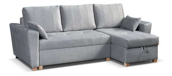 Moderna kutna garnitura; pogodna za dnevni boravak, ured ili recepciju. Kauč ima dva pretinca za odlaganje i mogućnost razvlačenja za povremeno spavanje dimenzija 126×204 cm.