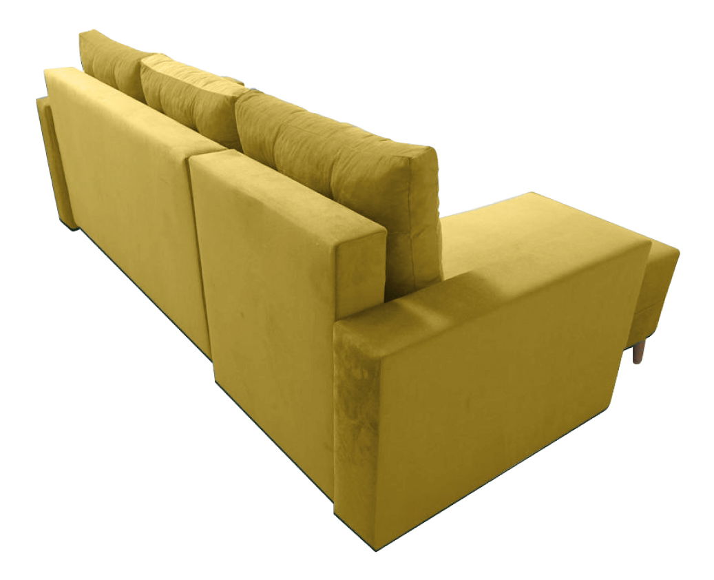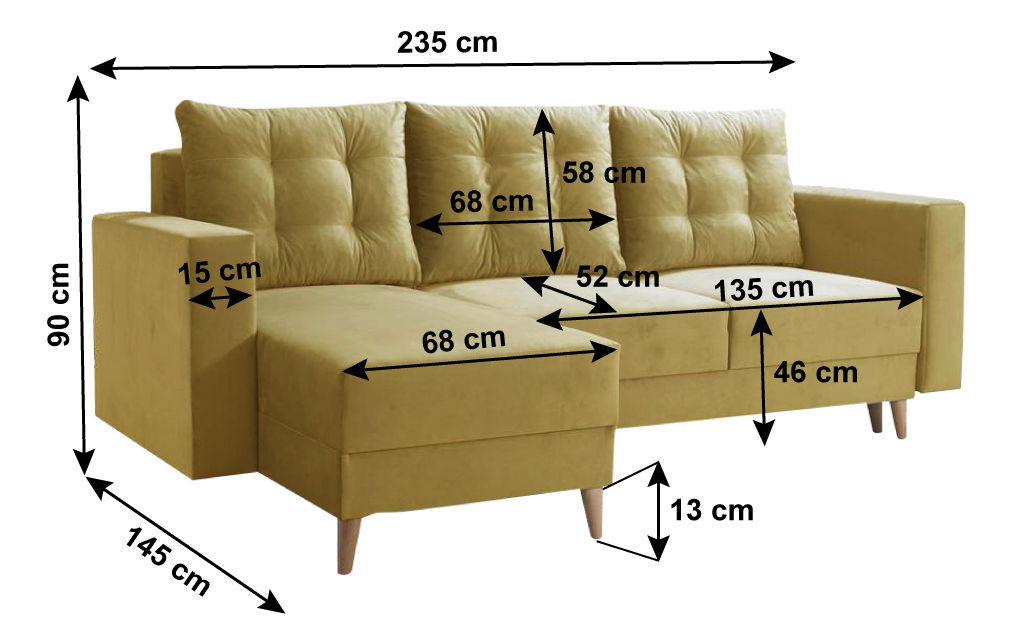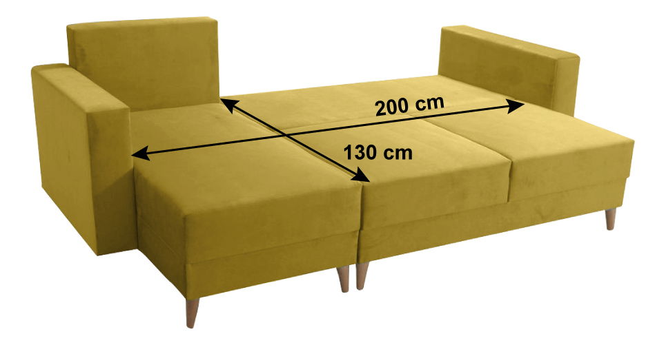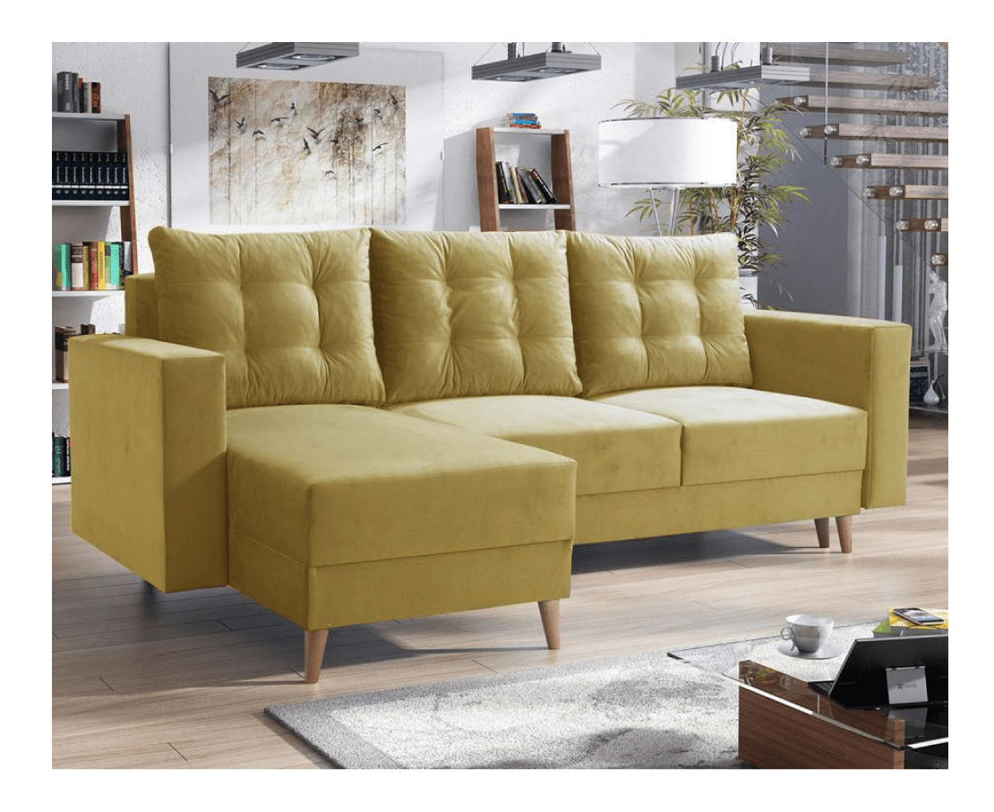 Na drvenim nogama, isporučuje se s tri jastuka, na razvlačenje, kutna, potpuno tapecirana, s prostorom za odlaganje, lijevo usmjerenje