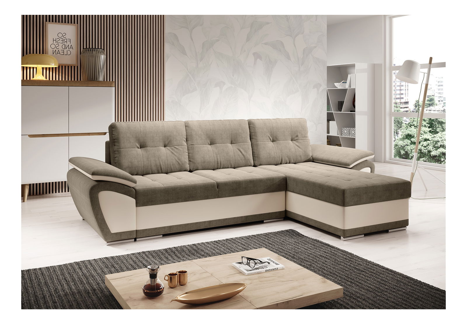 Na razvlačenje, kutna, s prostorom za odlaganje, ukrasno šivanje, na plastičnim nogama, potpuno tapecirana, desno usmjerenje, isporučuje se s jastucima (3x)