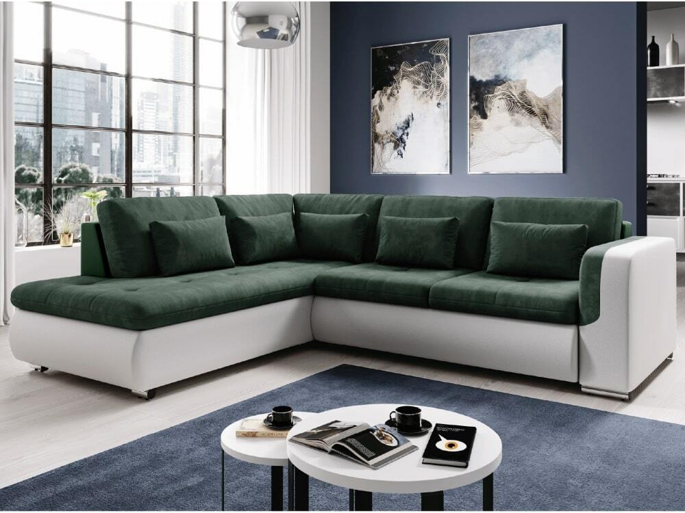 Na razvlačenje, kutna, plastične noge, potpuno tapecirana, vodootporan materija, lijevo usmjerenje, isporučuje se s jastucima, 5 velikih jastuka, 5 dekorativnih jastuka