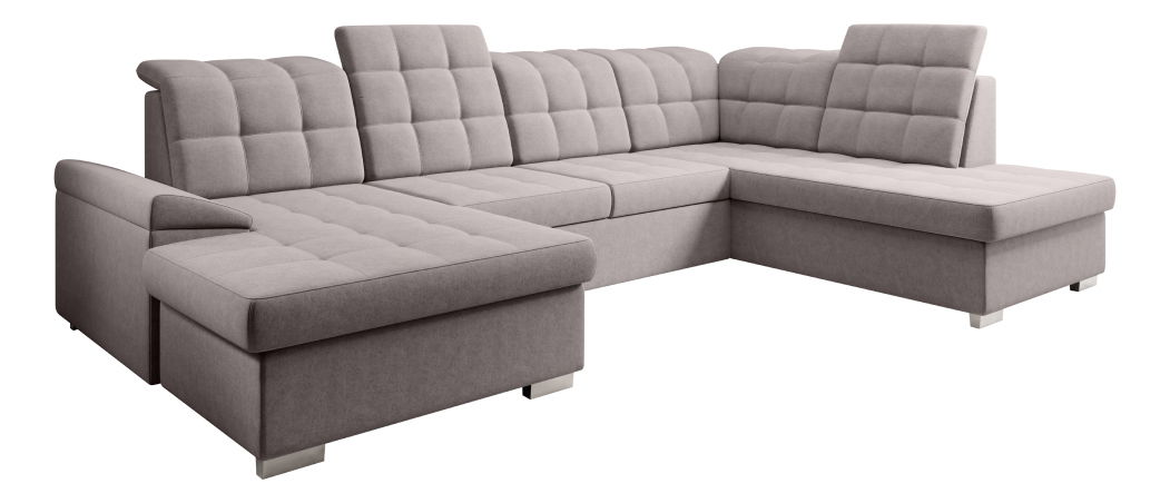 Na nogama, na razvlačenje, kutna, potpuno tapecirana, oblik U, sa dva skladišna prostora, podesivi nasloni za glavu, desno usmjerenje