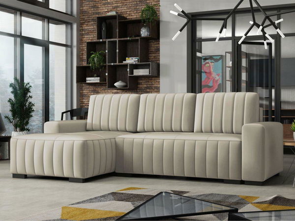 Kutna garnitura na razvlačenje sa spremnikom idealan je izbor za one koji traže udobnost i stil. Elegantna kutna sofa Pulah u obliku slova L komad je namještaja pogodan za sjedenje i spavanje. Tijekom dana pruža udobnu potporu za opuštanje, a navečer se bez napora pretvara u prostranu površinu za spavanje. Kvalitetu kutne sofe povećava prostrani spremnik za posteljinu i naslon u obliku pomičnih jastuka. Elegantni izgled kutne sofe sastoji se od jednostavnog korpusa i kvalitetne presvlake. Prošivena tkanina daje joj luksuzan izgled, zbog čega se ovaj stil savršeno uklapa u loft, glamour interijere, kao i u klasičan dizajn dnevnog boravka. Dimenzije: dužina: 240 cm, širina: 140 cm, visina: 85 cm, prostor za spavanje: 195 x 130 cm. Dimenzije spremnika: dužina: 127 cm, širina: 62 cm, visina: 22 cm. Strana: lijeva ili desna. Izvedba: okvir: borovo drvo + iverica, naslon: pjena T25/42, sjedište: pjena T25/42 + opruga, sofa se može razvući – pogodna za spavanje, ima spremnik, drvene noge, naslon u obliku pomičnih jastuka, jastuci na patent uključeni u cijenu, stražnja strana nije tapecirana – samo podstava. Jamstvo: 24 mjeseca.