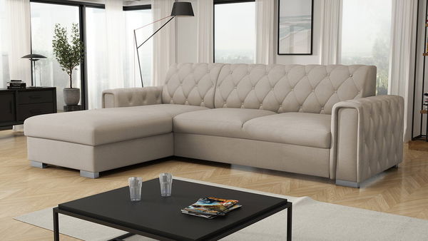 Kutna garnitura idealan je izbor za one koji traže udobnost i stil. Velika kutna sofa s funkcijom spavanja senzacionalan je način da uredite elegantan dnevni boravak! Prošivi na naslonu i rukonaslonima daju dašak luksuza i glamour stila. Odlično će se uklopiti u klasične i moderne aranžmane. Trendy boje privući će pažnju svakoga. Savršeno će poslužiti kao središnji element prostorije. Osim izgleda, nudi i mnogo praktičnih rješenja. Funkcija razvlačenja svakako će dobro doći. Ležaj nudi dodatni prostor za goste i omogućuje maksimalno iskorištavanje prostora. Zahvaljujući inovativnom mehanizmu brzo i jednostavno pretvarate sofu u prostran i udoban krevet. Dok ćete u praktičan spremnik diskretno pospremiti posteljinu, pokrivače, jastuke i druge predmete. Provedite ugodne zajedničke trenutke s obitelji na ovoj prekrasnoj kutnoj garnituri Nyzint. Gledanje televizije, filmova, čitanje knjige ili običan odmor bit će bolji nego ikada prije! Dimenzije: duljina: 267 cm, širina: 185 cm, visina: 85 cm, ležaj: 215 x 130 cm, spremnik: duljina: 175 cm, širina: 68 cm, visina: 21 cm. Strana kuta: lijeva ili desna. Izvedba: konstrukcija – ploča debljine 16 mm + borovina debljine 6 cm + iverica debljine 16 mm, sjedište: pjena T30/38 + val opruga tip B, naslon: pjena T25/42. Kutna sofa je na razvlačenje, s automatskim mehanizmom DELFIN, funkcijom spavanja, spremnikom za posteljinu, metalne noge u krom boji, tapecirani fiksni naslon, slobodnostojeća (naslon presvučen tkaninom). Jamstvo: 24 mjeseca.