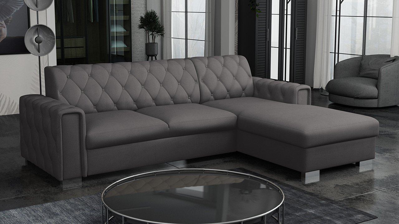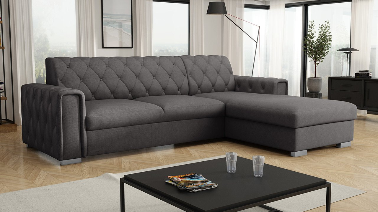 Kutna garnitura idealan je izbor za one koji traže udobnost i stil. Velika kutna sofa s funkcijom spavanja senzacionalan je način da uredite elegantan dnevni boravak! Prošivi na naslonu i rukonaslonima daju dašak luksuza i glamour stila. Odlično će se uklopiti u klasične i moderne aranžmane. Trendy boje privući će pažnju svakoga. Savršeno će poslužiti kao središnji element prostorije. Osim izgleda, nudi i mnogo praktičnih rješenja. Funkcija razvlačenja svakako će dobro doći. Ležaj nudi dodatni prostor za goste i omogućuje maksimalno iskorištavanje prostora. Zahvaljujući inovativnom mehanizmu brzo i jednostavno pretvarate sofu u prostran i udoban krevet. Dok ćete u praktičan spremnik diskretno pospremiti posteljinu, pokrivače, jastuke i druge predmete. Provedite ugodne zajedničke trenutke s obitelji na ovoj prekrasnoj kutnoj garnituri Nyzint. Gledanje televizije, filmova, čitanje knjige ili običan odmor bit će bolji nego ikada prije! Dimenzije: duljina: 267 cm, širina: 185 cm, visina: 85 cm, ležaj: 215 x 130 cm, spremnik: duljina: 175 cm, širina: 68 cm, visina: 21 cm. Strana kuta: lijeva ili desna. Izvedba: konstrukcija – ploča debljine 16 mm + borovina debljine 6 cm + iverica debljine 16 mm, sjedište: pjena T30/38 + val opruga tip B, naslon: pjena T25/42. Kutna sofa je na razvlačenje, s automatskim mehanizmom DELFIN, funkcijom spavanja, spremnikom za posteljinu, metalne noge u krom boji, tapecirani fiksni naslon, slobodnostojeća (naslon presvučen tkaninom). Jamstvo: 24 mjeseca.