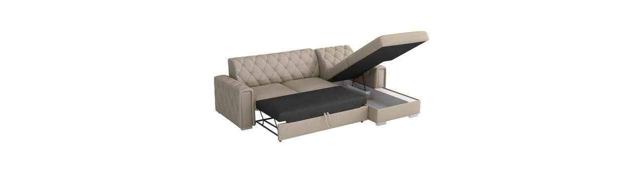 pjena T25/42,kutna garnitura je na razvlačenje,automatsko olakšanje razvlačenja, tip DELFIN,funkcija spavanja,prostor za odlaganje,metalne noge u krom boji,tapecirano naslonjalo fiksno pričvršćeno,kutna garnitura je slobodnostojeća (naslon je tapeciran tkaninom).