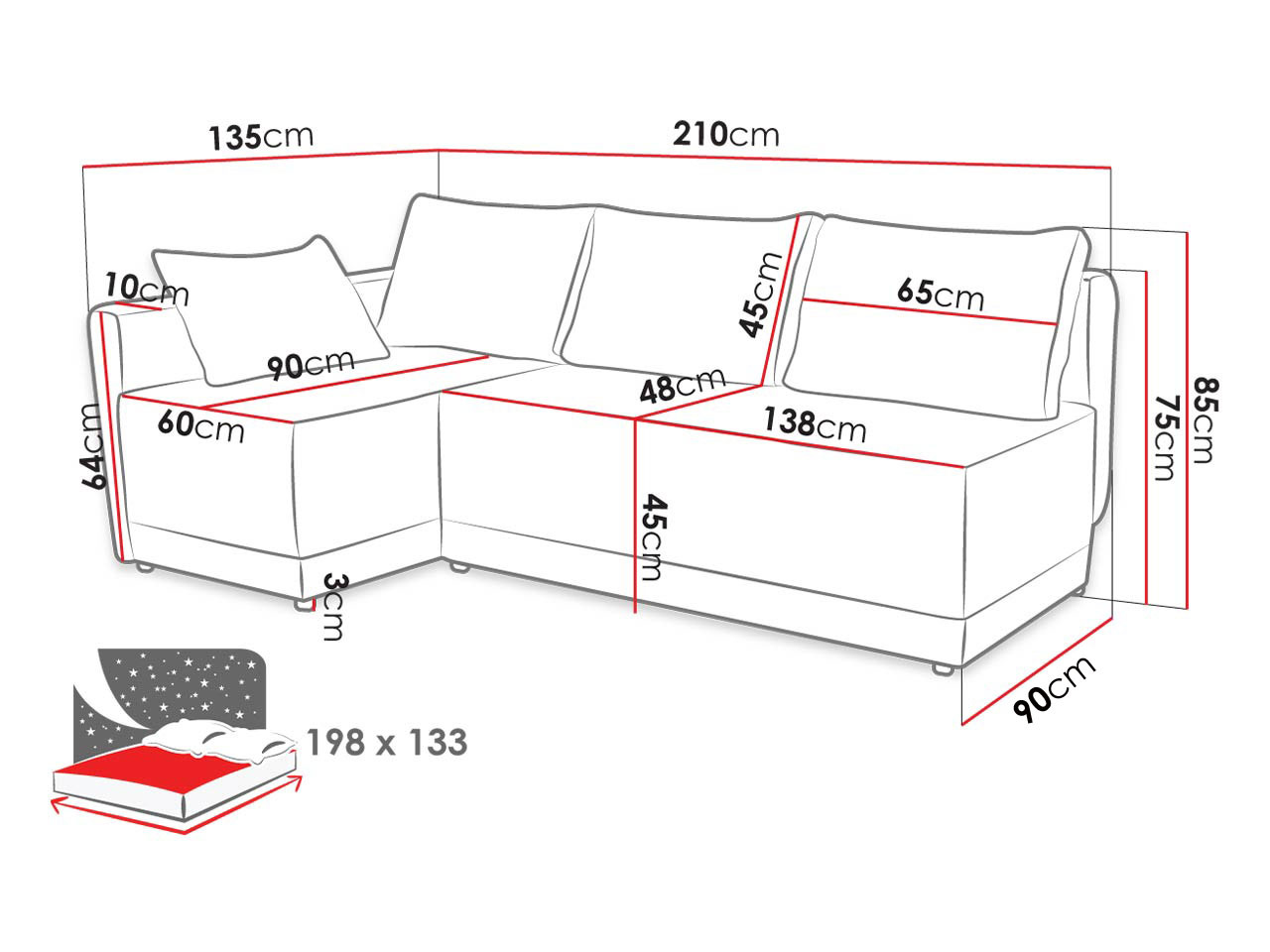 Kutna garnitura idealan je izbor za one koji traže udobnost i stil. Tražite garnituru koja će zamijeniti krevet za vas ili vaše goste? Ako da, onda imamo vrlo povoljnu ponudu – Piniata kutna garnitura! Model je opremljen oprugama koje se smatraju izdržljivima i T25/42 pjenom za udobnost tijekom korištenja. Kutni nasloni izrađeni su od udobnih jastuka. Veći jastuci imaju patentni zatvarač. Garnitura dodatno ima funkciju spavanja 198 cm x 133 cm i spremnik za posteljinu. Sam proces rasklapanja garniture vrlo je jednostavan i brz. Kutna garnitura nije slobodnostojeći model. Dimenzije: dužina: 210 cm, širina: 135 cm, visina: 85 cm, ležaj: 198 x 133 cm. Kutna strana: lijeva ili desna. Izvedba: okvir od borovine + iverica, naslon: T25/42 pjena + opruga, sjedalo: T25/42 pjena + opruga, garnitura na razvlačenje s funkcijom spavanja, spremnik za posteljinu, plastične noge, naslon u obliku pomičnih jastuka, jastuci uključeni – veliki s patentom – mali bez, garnitura nije slobodnostojeća (stražnja strana nije presvučena tkaninom). Dimenzije spremnika: dužina: 120 cm, širina: 57 cm, visina: 27 cm. Jamstvo: 24 mjeseca.