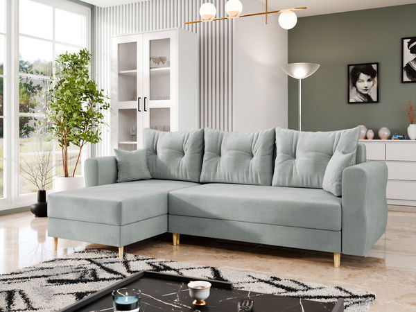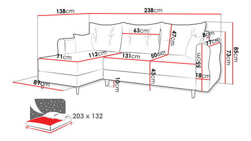 PrikazKutna garnitura je idealan izbor za one koji traže udobnost i stil. Odabirom kutne garniture na razvlačenje Saniolan L dobit ćete prostor u kojem ćete stvarati nezaboravne uspomene s najbližima. Prostrano sjedište i udoban naslon osiguravaju opuštanje kako tijekom dana, tako i tijekom sna. Vitke noge i moderna silueta daju kutnoj garnituri iznimnu lakoću, zahvaljujući čemu postaje elegantna središnja točka vašeg dnevnog boravka. Garnitura ima spremnik za pohranu. Kutna garnitura u dnevnoj sobi može primiti dodatni set posteljine za vaše goste. Odaberite kutnu garnituru Saniolan L na nogama i uživajte u jedinstvenom mjestu za odmor u vlastitom domu. Dimenzije: duljina: 238 cm, širina: 138 cm, visina: 85 cm, površina za spavanje: 203 x 132 cm, dimenzije spremnika: duljina: 131 cm, širina: 59 cm, visina: 24 cm. Strana kuta: univerzalna (odabir strane prilikom montaže). Izvedba: okvir: drvo + 16 mm iverica, sjedište: 8 cm T30 pjena + val opruge „tip A”, naslon: T30 pjena, debljine 8 cm, kutna garnitura je na razvlačenje, ima funkciju spavanja, spremnik, noge: drvene, naslon u obliku pomičnih jastuka punjenih mljevenom pjenom, jastuci uključeni – na patent, slobodnostojeća (stražnja strana presvučena tkaninom). Jamstvo: 24 mjeseca.