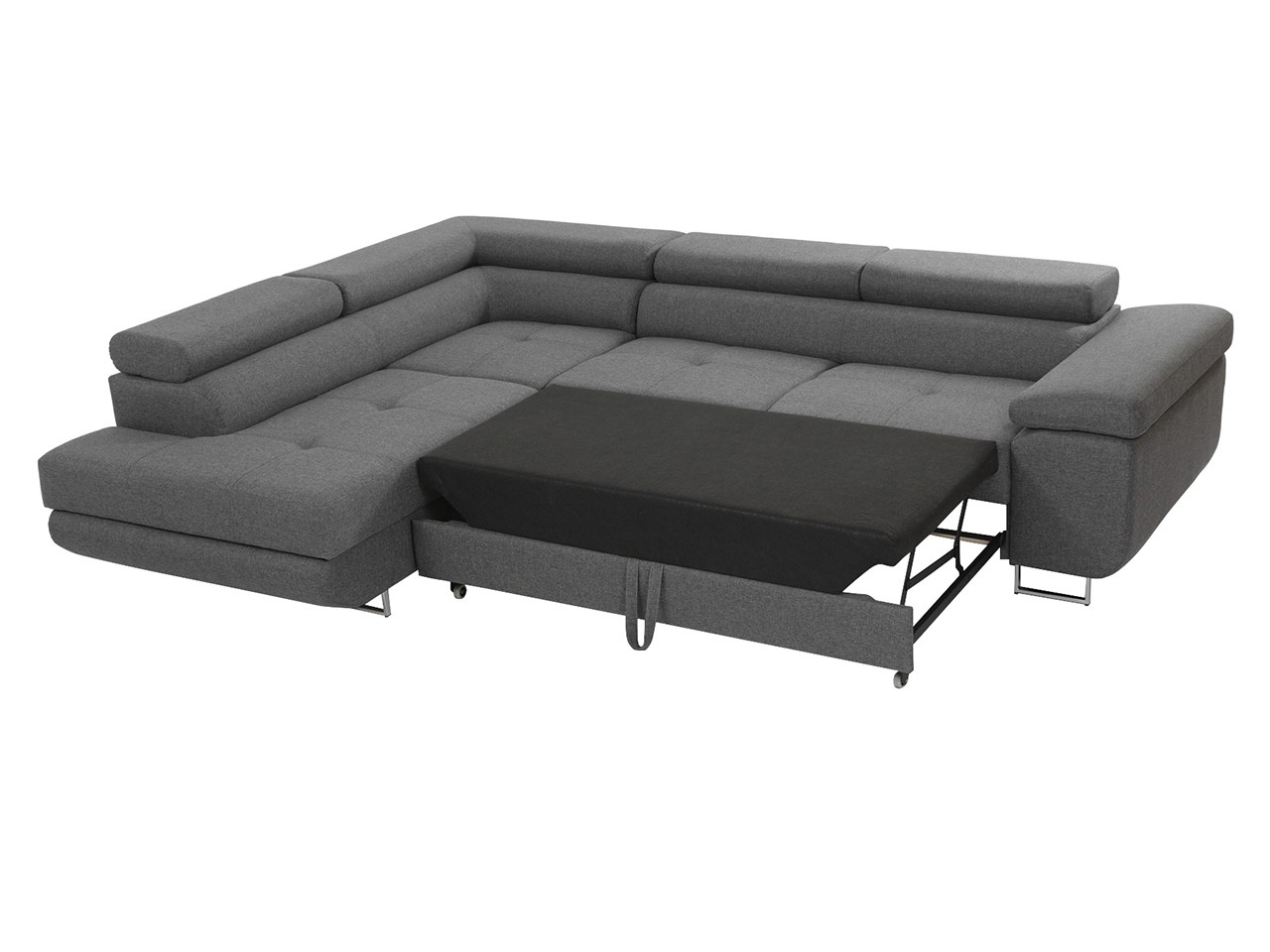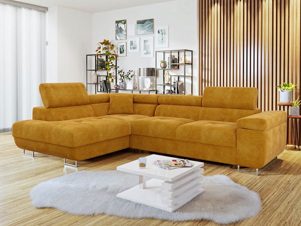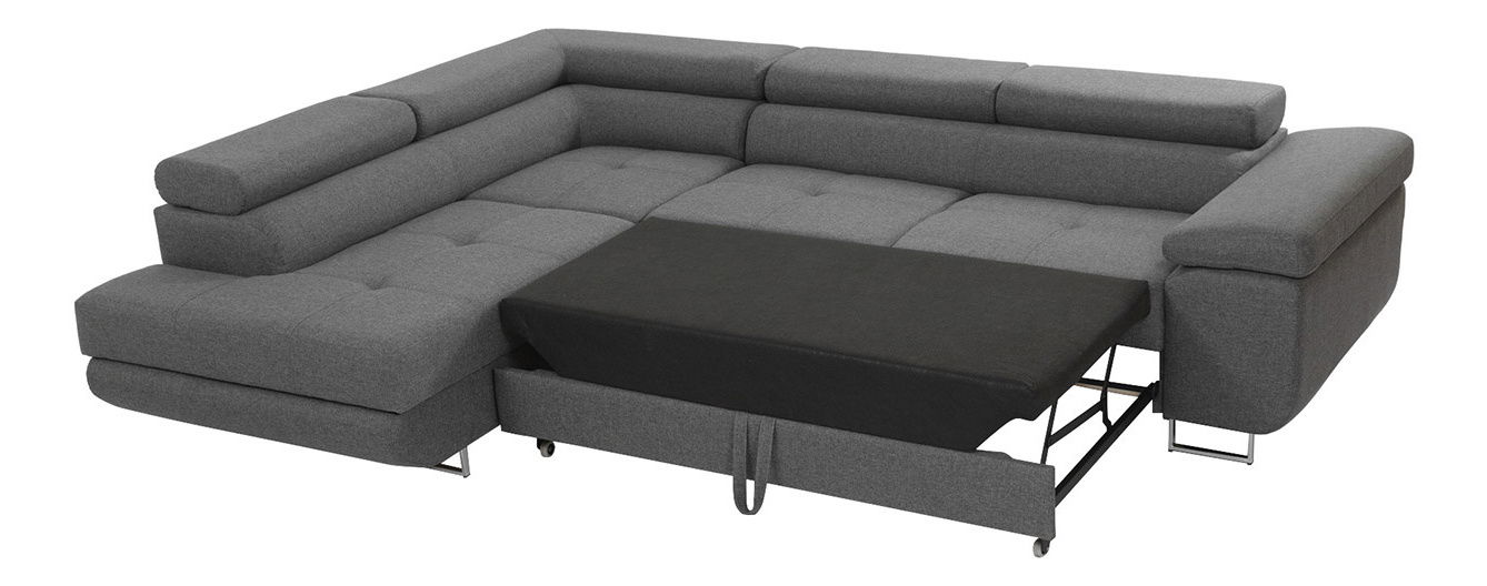 PrikazKutna garnitura na razvlačenje idealan je izbor za one koji traže udobnost i stil. Moderan izgled kutne garniture Torezio naglašava izvrstan stil vašeg dnevnog boravka. Boje presvlake savršeno se uklapaju s bilo kojom dekoracijom zidova i uzorkom poda. Trendy nijanse u kombinaciji s kromiranim nogama dodatno naglašavaju karakter interijera i ostalog namještaja. Garnitura u obliku slova L izvrsno se slaže s okruglim stolićem za kavu kao i s pravokutnim stolićem za kavu. Ovaj skladan duo idealan je za dnevni boravak ili gostinjsku sobu. Pruža mnogo prostora za sjedenje i stvara savršene uvjete za druženje s prijateljima. Promišljen dizajn i dodaci zaslužni su za veću udobnost odmora. Podesivi nasloni za glavu zasigurno će se svidjeti cijeloj obitelji. Mogu se prilagoditi obliku tijela i djece i odraslih. Prednost garniture je i funkcija razvlačenja. U rasklopljenom stanju pruža udobne uvjete za svakodnevni san. Prostrani spremnik za posteljinu rješava problem odlaganja jastuka i pokrivača. Pomaže u održavanju reda u dnevnom boravku i nudi dodatni prostor za sezonsku odjeću i druge rijetko korištene stvari. Dimenzije: duljina: 274 cm, širina: 203 cm, visina: 70–87 cm, površina za spavanje: 198 x 125 cm, dimenzije spremnika: duljina: 173 cm, širina: 92 cm, visina: 17 cm. Strana garniture: lijeva ili desna. Izvedba: konstrukcija sjedala – drveni okvir + valovita opruga + filc + vata + pjena T2544 debljine 10 cm, konstrukcija naslona – drveni okvir + valovita opruga + filc + vata + pjena T2544 debljine 8 cm, funkcija razvlačenja, spremnik za posteljinu, podesivi nasloni za glavu, noge visine 9 cm, prednji dio kromirani metal, stražnji dio plastika, tapecirani naslon fiksiran, slobodnostojeća garnitura (stražnja strana tapecirana tkaninom). Mogućnost kupnje odgovarajućih proizvoda: stolić za kavu Komoso, regal Runoya I. Jamstvo: 24 mjeseca.