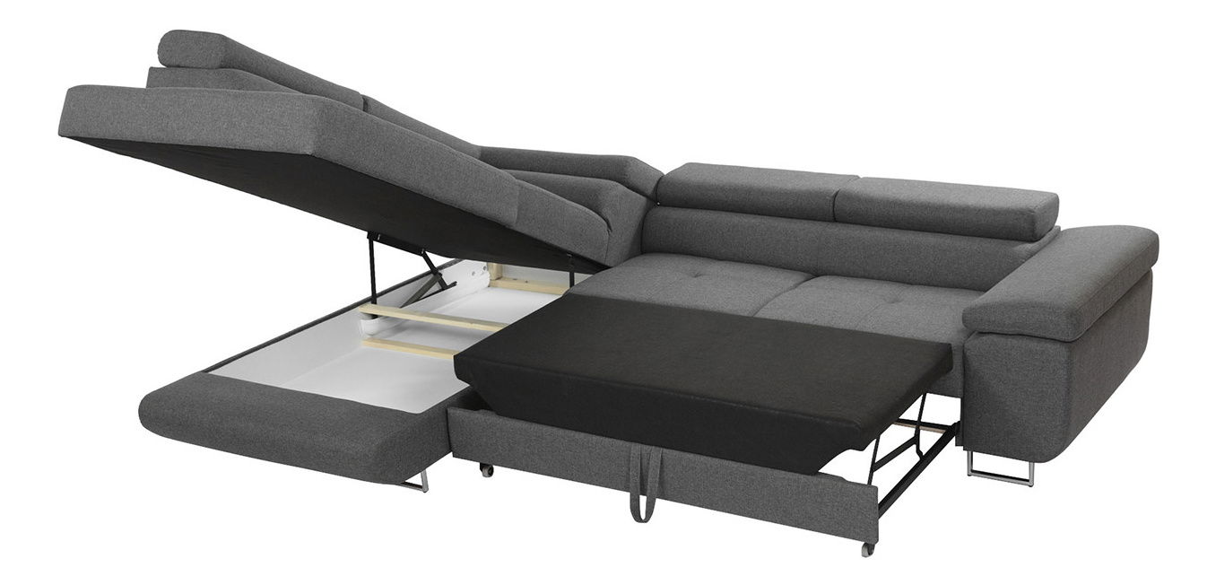 PrikazKutna garnitura na razvlačenje idealan je izbor za one koji traže udobnost i stil. Moderan izgled kutne garniture Torezio naglašava izvrstan stil vašeg dnevnog boravka. Boje presvlake savršeno se uklapaju s bilo kojom dekoracijom zidova i uzorkom poda. Trendy nijanse u kombinaciji s kromiranim nogama dodatno naglašavaju karakter interijera i ostalog namještaja. Garnitura u obliku slova L izvrsno se slaže s okruglim stolićem za kavu kao i s pravokutnim stolićem za kavu. Ovaj skladan duo idealan je za dnevni boravak ili gostinjsku sobu. Pruža mnogo prostora za sjedenje i stvara savršene uvjete za druženje s prijateljima. Promišljen dizajn i dodaci zaslužni su za veću udobnost odmora. Podesivi nasloni za glavu zasigurno će se svidjeti cijeloj obitelji. Mogu se prilagoditi obliku tijela i djece i odraslih. Prednost garniture je i funkcija razvlačenja. U rasklopljenom stanju pruža udobne uvjete za svakodnevni san. Prostrani spremnik za posteljinu rješava problem odlaganja jastuka i pokrivača. Pomaže u održavanju reda u dnevnom boravku i nudi dodatni prostor za sezonsku odjeću i druge rijetko korištene stvari. Dimenzije: duljina: 274 cm, širina: 203 cm, visina: 70–87 cm, površina za spavanje: 198 x 125 cm, dimenzije spremnika: duljina: 173 cm, širina: 92 cm, visina: 17 cm. Strana garniture: lijeva ili desna. Izvedba: konstrukcija sjedala – drveni okvir + valovita opruga + filc + vata + pjena T2544 debljine 10 cm, konstrukcija naslona – drveni okvir + valovita opruga + filc + vata + pjena T2544 debljine 8 cm, funkcija razvlačenja, spremnik za posteljinu, podesivi nasloni za glavu, noge visine 9 cm, prednji dio kromirani metal, stražnji dio plastika, tapecirani naslon fiksiran, slobodnostojeća garnitura (stražnja strana tapecirana tkaninom). Mogućnost kupnje odgovarajućih proizvoda: stolić za kavu Komoso, regal Runoya I. Jamstvo: 24 mjeseca.