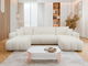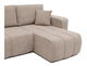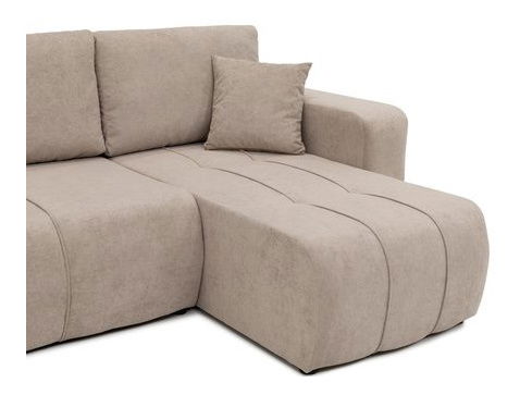 9 cm debela pjena T30 + valovita opruga „tip A“,kutna garnitura je na razvlačenje,ima funkciju spavanja,spremnik za posteljinu,crne PVC noge,naslon u obliku pomičnih jastuka punjenih pjenastim granulama,jastuci na patent,jastuci uključeni u cijenu,slobodno stojeća kutna sofa (stražnja strana presvučena tkaninom).