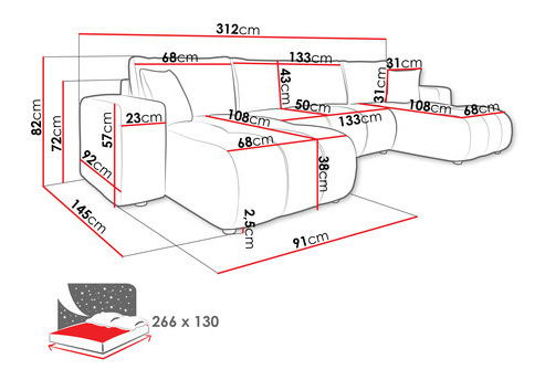PrikazKutna garnitura je idealan izbor za one koji traže udobnost i stil. Kutna garnitura Larow U s funkcijom spavanja je centar za opuštanje, mjesto okupljanja i dodatni prostor za relaksaciju u jednom. Prostrani oblik pruža dovoljno mjesta za sjedenje. Idealan je za svakodnevni odmor kao i za druženja s većim društvom. Ima široka, mekana sjedala zbog kojih ćete poželjeti sjesti s šalicom kave i dobrom knjigom. Dodatna prednost je spremište za posteljinu – skriveno, ali lako dostupno, savršeno za pokrivače, jastuke ili druge stvari koje želite imati pri ruci, ali ne na vidiku. Kutna garnitura na razvlačenje Larow U uklopit će se u svaki moderan interijer koji zahtijeva funkcionalna rješenja. Dimenzije: širina: 312 cm, dubina: 145 cm, visina: 72–82 cm, ležaj: 266 x 130 cm, spremište: 128 x 60 x 22 cm. Kutna strana: univerzalna (stranu bira kupac pri montaži). Izvedba: okvir: 30 mm masivno crnogorično drvo + 16 mm iverica, sjedalo i naslon: 9 cm pjena T30 + val opruga "tip A". Garnitura je na razvlačenje, ima funkciju spavanja, spremište, crne PVC noge, naslon u obliku pomičnih jastuka punjenih pjenastim granulama, jastuci s patentnim zatvaračem, jastuci uključeni, samostojeća kutna garnitura (stražnja strana presvučena tkaninom). Jamstvo: 24 mjeseca.