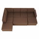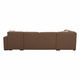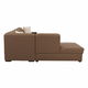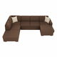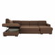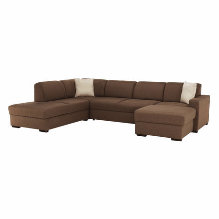 Moderan kauč Yorki s 2 prostora za odlaganje posteljine. Mogućnost razvlačenja. Presvučen je šanilom smeđe boje. Uključuje i dva bež jastuka.