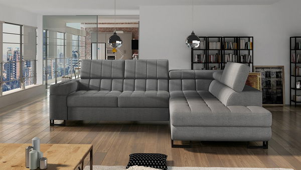 Kutna garnitura izrađena je prema uzorku slova "L", što vam omogućuje korištenje kuta u sobi ili odvajanje pojedinačnih zona. Samostojeći je model pa ga lako možete smjestiti na sredinu sobe – stražnja strana mu je presvučena tkaninom. Najveće prednosti sjedalice su podesivi nasloni za glavu koji povećavaju udobnost; kutija za pohranjivanje koja omogućuje spremanje posteljine ili drugih dodataka, kao i funkcija spavanja koja pruža idealno mjesto za odmor u dvoje. Sofa je model koji ima zanimljiv izgled i pruža nevjerojatnu udobnost. Svakako ispunjavaju očekivanja svih ljubitelja modernog izgleda.
