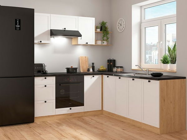Kutna kuhinja Junona Line savršeno je rješenje za one koji cijene fleksibilnost pri uređenju prostora. Zahvaljujući svojoj svestranosti, konstrukcija se lako može prilagoditi lijevom ili desnom kutu, ovisno o vašim individualnim potrebama i rasporedu prostorije. Takva kuhinja ne samo da optimizira iskorištavanje raspoloživog prostora, već stvara i ugodno i funkcionalno mjesto za kuhanje i provođenje vremena s najbližima. Kuhinjski blok Junona Line savršeno je organiziran prostor. Donji dio nudi sve što je potrebno: praktične ormariće s vratima, prostrani ormarić ispod sudopera, prostor za pećnicu i funkcionalan set od tri ladice za kuhinjske dodatke. Gornji zidni ormarići pružaju dodatni prostor za posuđe i namirnice. Elegantne, jednostavne ručke naglašavaju minimalistički karakter namještaja. S kolekcijom Junona stvorit ćete kuhinju koja će biti ne samo lijepa, već i praktična za svakodnevnu upotrebu.