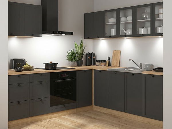 Kutna kuhinja Junona Line savršeno je rješenje za one koji cijene fleksibilnost pri uređenju prostora. Zahvaljujući svojoj svestranosti, konstrukcija se lako može prilagoditi lijevom ili desnom kutu, ovisno o vašim individualnim potrebama i rasporedu prostorije. Takva kuhinja ne samo da optimizira iskorištavanje raspoloživog prostora, već stvara i ugodno i funkcionalno mjesto za kuhanje i provođenje vremena s najbližima. Kuhinjski blok Junona Line savršeno je organiziran prostor. Donji dio nudi sve što je potrebno: praktične ormariće s vratima, prostrani ormarić ispod sudopera, prostor za pećnicu i funkcionalan set od tri ladice za kuhinjske dodatke. Gornji zidni ormarići pružaju dodatni prostor za posuđe i namirnice. Elegantne, jednostavne ručke naglašavaju minimalistički karakter namještaja. S kolekcijom Junona stvorit ćete kuhinju koja će biti ne samo lijepa, već i praktična za svakodnevnu upotrebu.