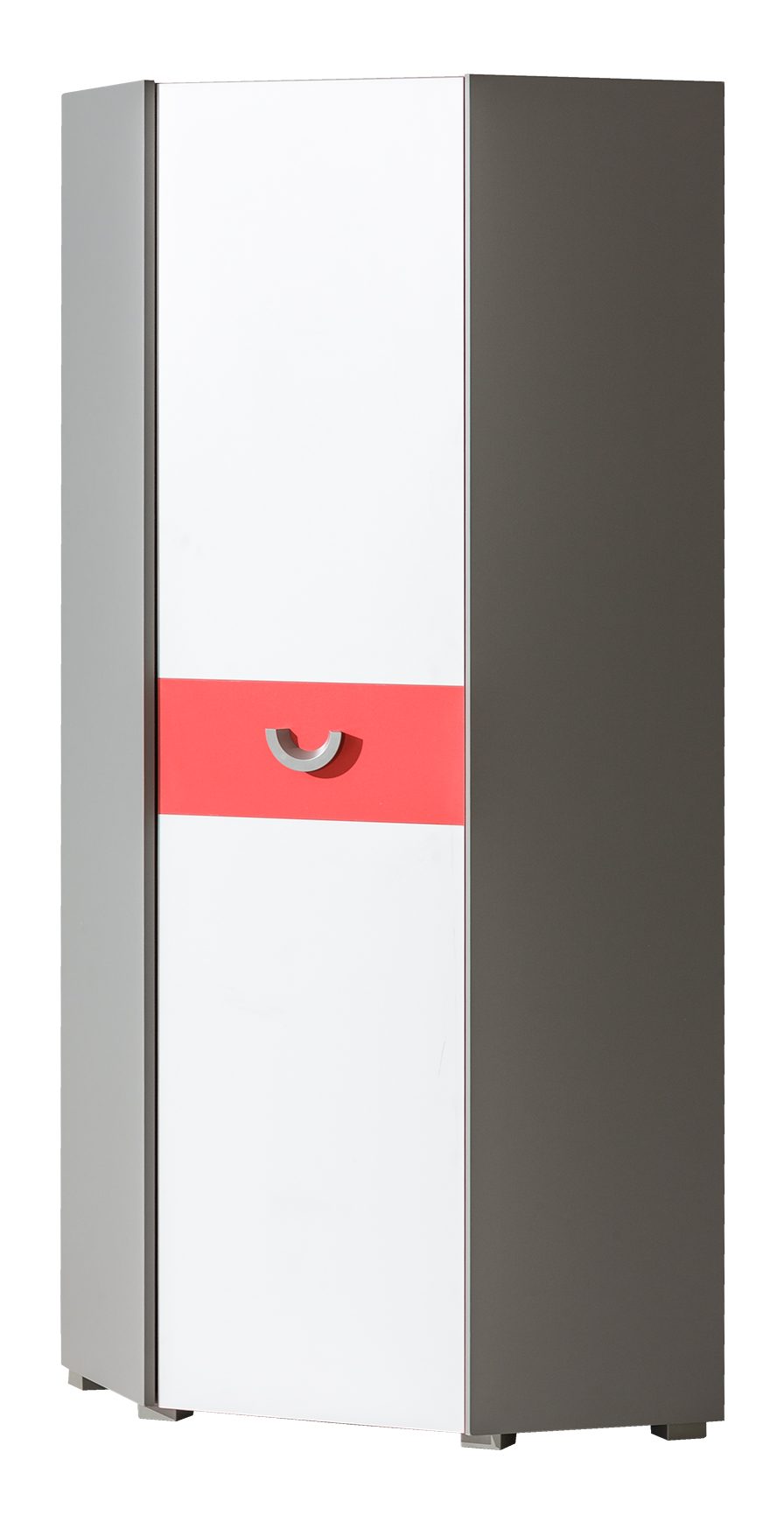 Kutni garderobni ormar prikladan za manje prostore. U unutrašnjosti se nalazi šipka za vješanje odjeće i 4 police. Izrada od laminiranih ploča s ABS rubovima.