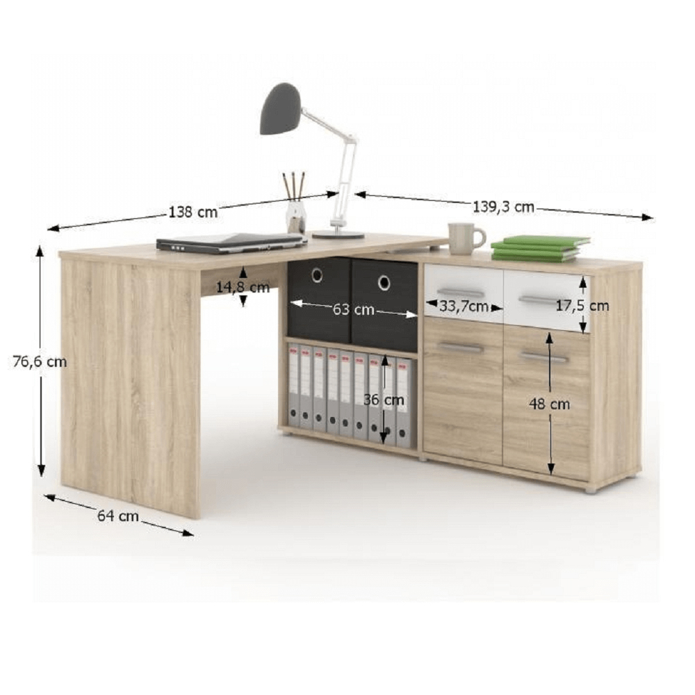 Praktičan PC stolić u boji hrast sonoma. Prvi dio se sastoji od 2 vrata i 2 ladice bijele boje. Pored su dvije police za dokumente. Lijeva gornja ploča je pričvršćena na glavni dio minimalističkim spojkama.