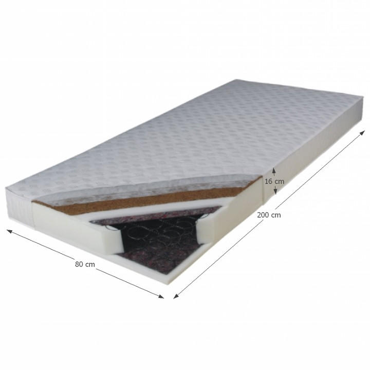 Jezgru madraca čine kvalitetne bonell opruge koje su obložene s obje strane lateks-kokosovom pločom i poliuretanskom pjenom T25-15 mm. Presvlaka je prošivena antialergijskim vlakom 80 g/m². Madrac je tvrd zbog lateks ploče.