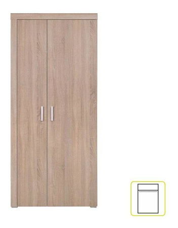 Dulap mare de haine din două piese cu bara de agățat, un raft înăuntru și o ușă plină cu deschidere din mijloc. Dulapul este echipat cu mâner subțire, minimalist și este fabricat din nuanța laminată DTD a lemnului de stejar Sonoma.