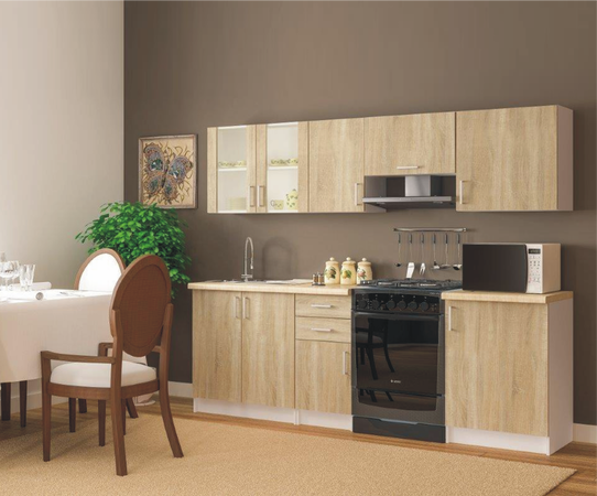 Cu ajutorul setului de bucătărie Vika vă veți aranja o bucătărie stilată, modernă și practică. Fronturile dulapurilor și ușilor sunt în versiunea plăcută de culoarea stejarului de sonoma. Dulapurile din partea de inferioară au un blat de lucru.