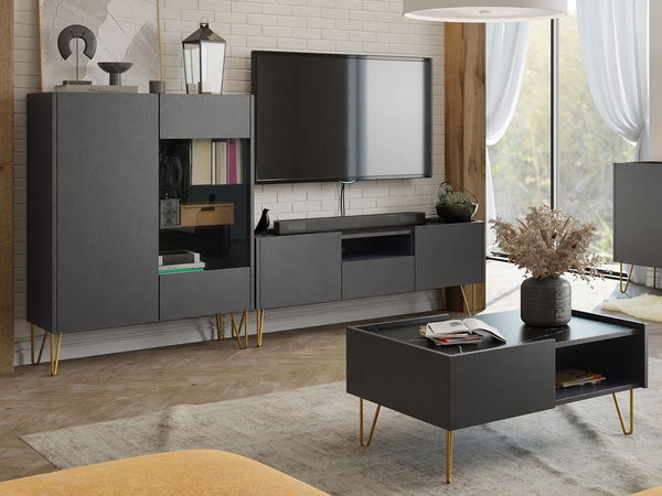 Set za dnevni boravak Animere II je idealan izbor za one koji traže udobnost i stil. Tražite namještaj za sobu koji će vašem interijeru dodati stil i eleganciju? Set Animere je stvoren za vas! Visoke zlatne noge, mat crno kućište i ukrasna gornja ploča s mramornim uzorkom privlače pažnju. Ova suptilna kombinacija tekstura i boja djeluje izuzetno elegantno i bezvremenski. Animere je funkcionalni set za dnevni boravak koji se sastoji od tri osnovna elementa. Osim prostrane stolne ploče, stolić za kavu nudi dodatni prostor za pohranu u obliku dvije ladice. TV stolić organizira prostor oko televizora, a staklena vitrina savršeno prikazuje predmete koji su vam važni. Namještaj iz ove kolekcije odlikuje se elegantnim dizajnom i modernim rješenjima. Ladice su opremljene punim izvlačenjem, dok se ormarići otvaraju sustavom "push to open", koji olakšava svakodnevnu upotrebu. Dimenzije: TV stolić Animere ARTV144: širina: 144 cm, visina: 55 cm, dubina: 37 cm, Vitrina Animere AWT97: širina: 97 cm, visina: 122 cm, dubina: 37 cm, Stolić za kavu Animere AL97: širina: 97 cm, visina: 45 cm, dubina: 65 cm Izvedba: laminirana ploča debljine 16 mm, obrubi od ABS-a i papira, noge FI 10 mm, plastificirane zlatne boje, sustav bez ručki – izduženi rub + otvaranje na pritisak, uvučene šarke, kuglične vodilice, na prednjoj strani kaljeno staklo 4 mm i dvije staklene police 4 mm – vitrina Jamstvo: 24 mjeseca