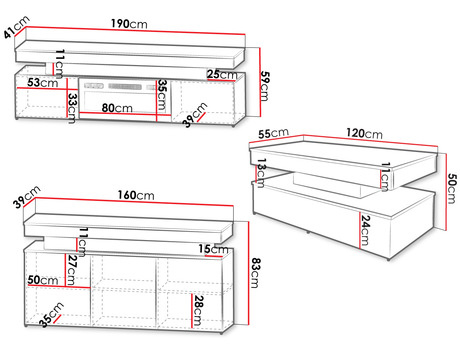 PrikazSet za dnevni boravak s biokaminom idealan je izbor za one koji traže udobnost i stil. Impresivan i praktičan set namještaja za dnevni boravak Lestirola II savršeno je rješenje za stvaranje skladnog i očaravajućeg prostora. Prekrasan dizajn obogaćen rasvjetom osvijetlit će interijer i dati mu ugodnu toplinu. Ovaj višedijelni set savršeno će se uklopiti u moderan stil. Predstavljeni namještaj pruža ne samo zanimljiv vizualni dojam već i veliku funkcionalnost. Komoda, TV ormarić i stolić za kavu savršena su osnova za pohranu, dekoracije i multimedijske uređaje. Dodatni element je biokamin, zanimljiva alternativa tradicionalnom kaminu. Neki dijelovi nemaju ručke, a otvaraju se pomoću sustava push to open. Dimenzije: komoda Lestirola 3D 160 s LED rasvjetom: širina: 160 cm, visina: 83 cm, dubina: 39 cm. TV ormarić s kaminom Lestirola EF 2D 190: širina: 190 cm, visina: 59 cm, dubina: 41 cm. Stolić za kavu Lestirola s LED rasvjetom: širina: 120 cm, visina: 50 cm, dubina: 55 cm. Izvedba: korpus: laminirana ploča 16/17/19 mm, fronte: MDF ploča 18 mm, rubovi: ABS (fronte), PVC (korpus), stražnja strana od HDF ploče, metalne šarke s tihim zatvaranjem, noge: klizači, bez ručki, plinski podizači (TV ormarić), polica: kaljeno staklo debljine 5 mm (TV ormarić), sustav otvaranja "PUSH TO OPEN", plavo LED svjetlo uključeno u cijenu. Posebna prednost ormarića je električni kamin: realistični LED plamen, podesiva funkcija grijanja (16–28 °C), plamen neovisan o grijanju, napajanje: 220–240 V / 50 Hz, snaga: 1400–1600 W, daljinski upravljač, upravljačka ploča, kristali u ložištu, kaljeno staklo. Zbog topline koju proizvodi kamin ne preporučuje se postavljanje televizora izravno na ormarić. Jamstvo: 24 mjeseca.