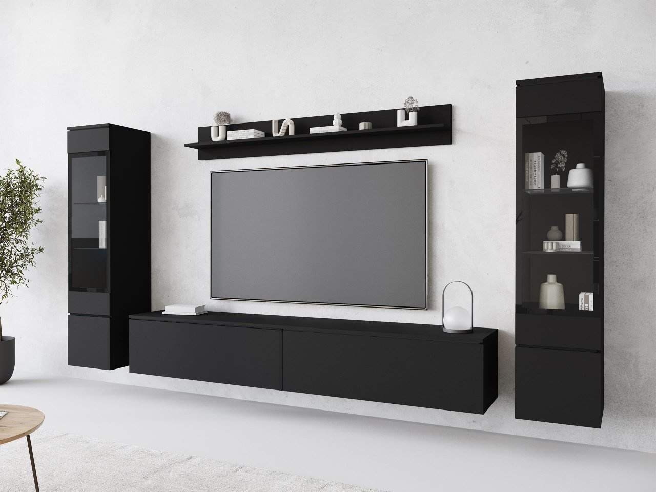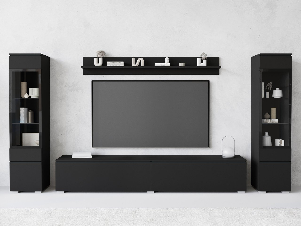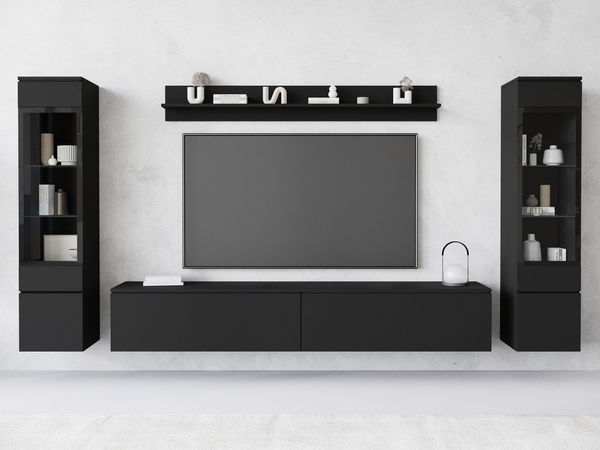 Set za dnevni boravak idealan je izbor za one koji traže udobnost i stil. Zanimljiv stil zidne jedinice Sawoti naglasit će dekor modernih industrijskih interijera, kao i modernih loftova. Široka paleta boja u kojima je set dostupan proširuje mogućnosti uređenja. Možete stvoriti upečatljiv akcent u dnevnom boravku ili, suprotno, skladnu cjelinu s dekorom zidova i uzorkom poda. Kombinacija TV ormarića s dvije vitrine i visećom policom nudi prostor za odlaganje predmeta potrebnih u dnevnom boravku. Također ćete pronaći zonu za izlaganje dekoracija koje uljepšavaju prostor. Funkcionalnost viseće vitrine povećavaju uključene nogice. Prema želji, cijeli set možete objesiti ili postaviti na pod. Dimenzije elemenata seta: Vitrina (2x): širina: 30 cm, visina: 130 cm, dubina: 33 cm. Viseća polica: širina: 139 cm, visina: 18 cm, dubina: 14 cm. TV ormarić: širina: 180 cm, visina: 30 cm, dubina: 33 cm. Izvedba: laminirana ploča 16 mm, fronte: mat ili polusjajna ploča 15 mm, ABS rubovi, stražnji rubovi papir, kaljeno staklo, model bez ručki, otvaranje pomoću fronte koja strši iznad tijela, namještaj univerzalan – može se objesiti ili postaviti (noge uključene), LED bijelo osvjetljenje kao dodatna opcija uz nadoplatu. Jamstvo: 24 mjeseca.