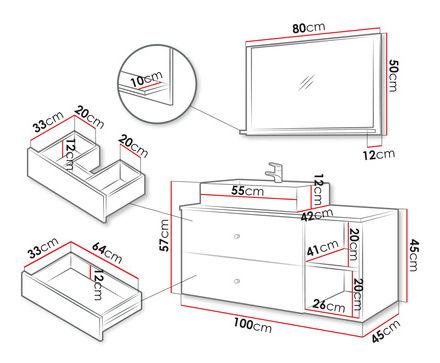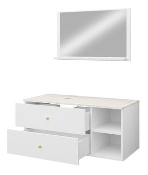 PrikazKupaonski namještaj je idealan izbor za one koji traže udobnost i stil. Kupaonski set Kiegi I zrači elegancijom. Zlatni detalji u kombinaciji s mramornim uzorkom djeluju izuzetno luksuzno i upotpunjuju prostor kupaonice. Dizajn ormarića ispod umivaonika promišljen je s aspekta funkcionalnosti. Dvije ladice i otvorene police omogućuju lak pristup kozmetici i održavanje reda u prostoriji. Karakterističan element kupaonskog seta je ploča s uzorkom koji imitira mramor. Izrađena je od kvalitetne ploče, otporna je na vlagu i lako se čisti. Praktičan dodatak seta je ogledalo koje savršeno pristaje uz ostatak namještaja i dizajn interijera. Dimenzije: Kiegi ogledalo: širina: 80 cm, visina: 50 cm, dubina: 12 cm. Kiegi ormarić ispod umivaonika: širina: 100 cm, visina: 45 cm, dubina: 45 cm. Umivaonik za ploču 550x420x115 (dostupan uz nadoplatu): širina: 55 cm, visina: 12 cm, dubina: 42 cm. Izvedba: 16 mm laminirana iverica, ABS rub 0,5 mm, stražnja strana od HDF ploče, aluminijske zlatne ručke, donje vodilice za ladice, umivaonik za ploču uz nadoplatu, sifon uz nadoplatu, slavina za umivaonik prikazana na fotografiji nije uključena u cijenu, elementi u mramornoj boji izrađeni su od 16 mm laminirane iverice. Jamstvo: 24 mjeseca.