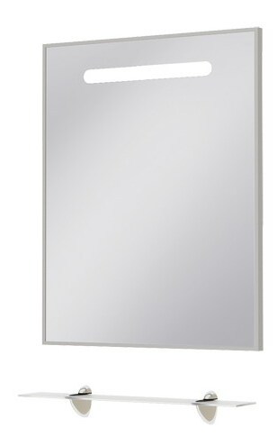 Ogledalo na zidu s jednostavnim i modernim dizajnom. Osvijetljeno je i dolazi s praktičnom staklenom policom za pohranu kozmetike ili higijenskih predmeta.