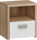Jednostavan noćni stolić s jednom ladicom u donjem dijelu i jednom otvorenom policom između gornje ploče i ladice. Siva ručka od masiva.