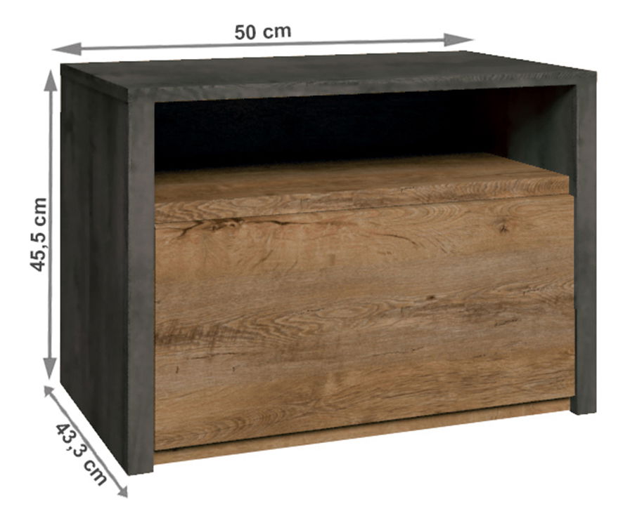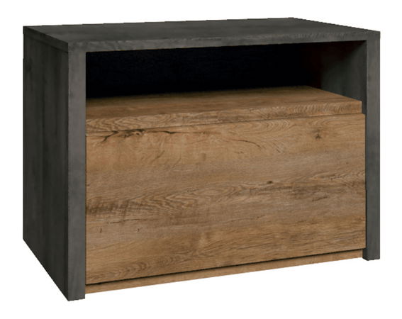 Modestus je noćni stolić s jednim otvorenim prostorom za odlaganje. Pod njim je ormarić s vratima. Moderan dizajn bez ručki.
