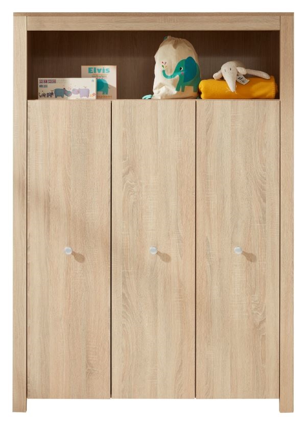 Drveni dječji ormar s policama i vješalicom za odjeću. Ormar nudi ukupno šest kutija za odlaganje i dvije šipke za vješalice.
