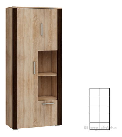 Praktičan, dvodijelni, visoki ormar s policama s jednim vratima smještenima u lijevom dijelu. Ormar stoji na minimalističkim sivim nogama.