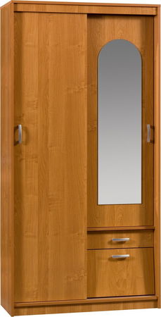 Garderobni ormar s kliznim vratima slijeva i klasičnim vratima zdesna. U desnom dijelu se nalazi ogledalo, police i ladice. U lijevom dijelu je šipka za vješanje odjeće i jedna polica. Boja: joha i bukva.