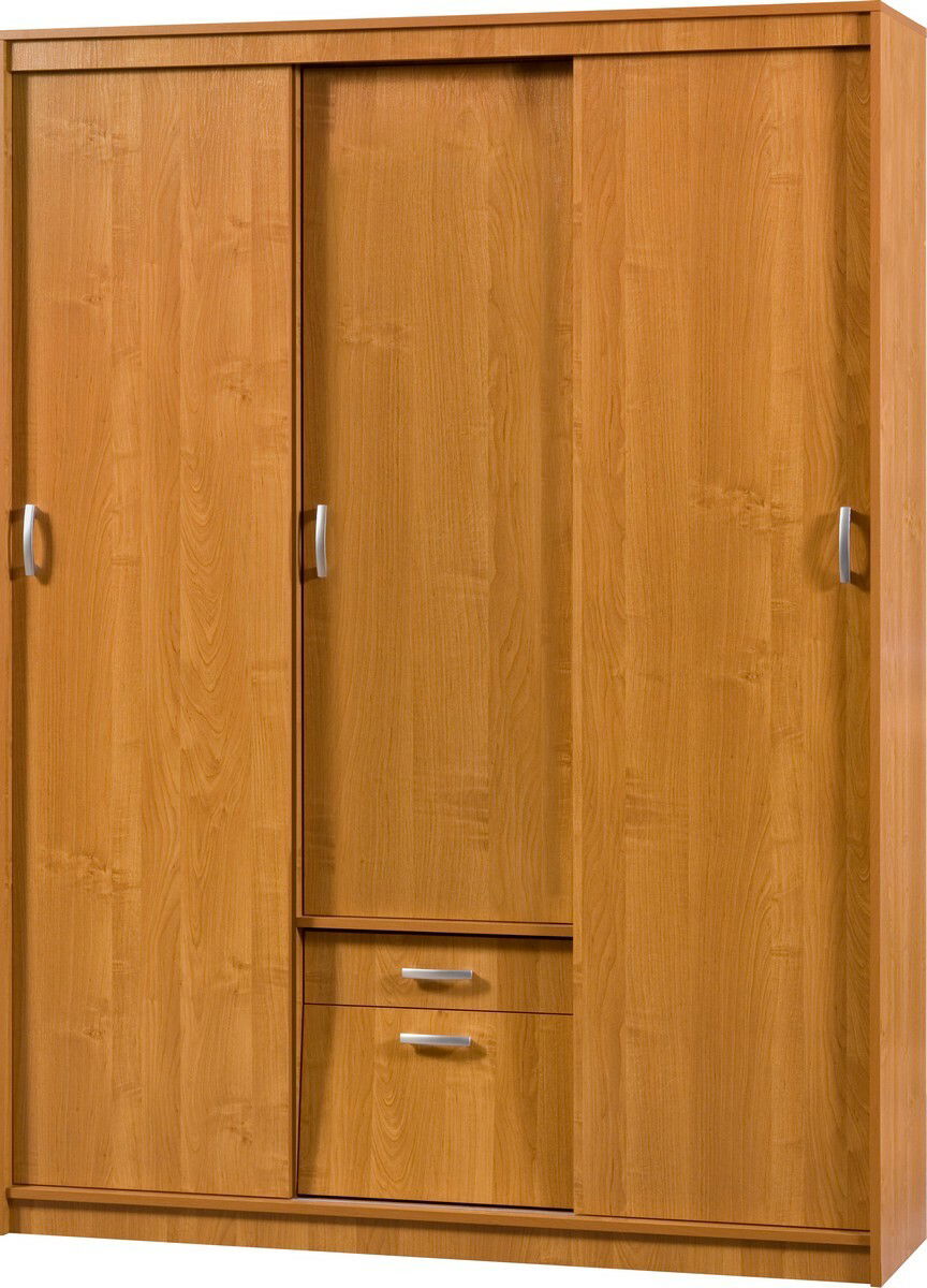 Garderobni ormar s kliznim vratima. Ima šipku za vješanje odjeće, police i ladice. Boja bukve i johe.