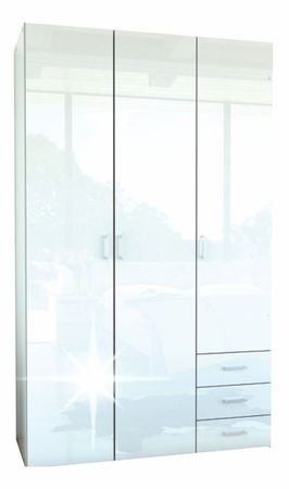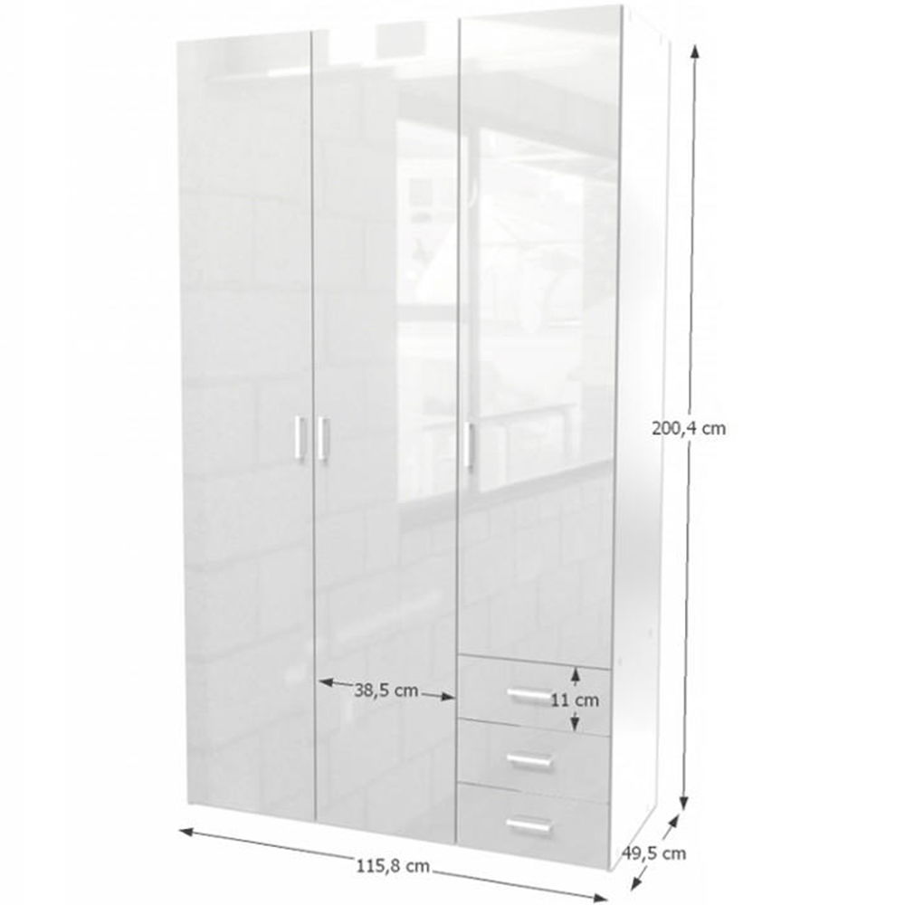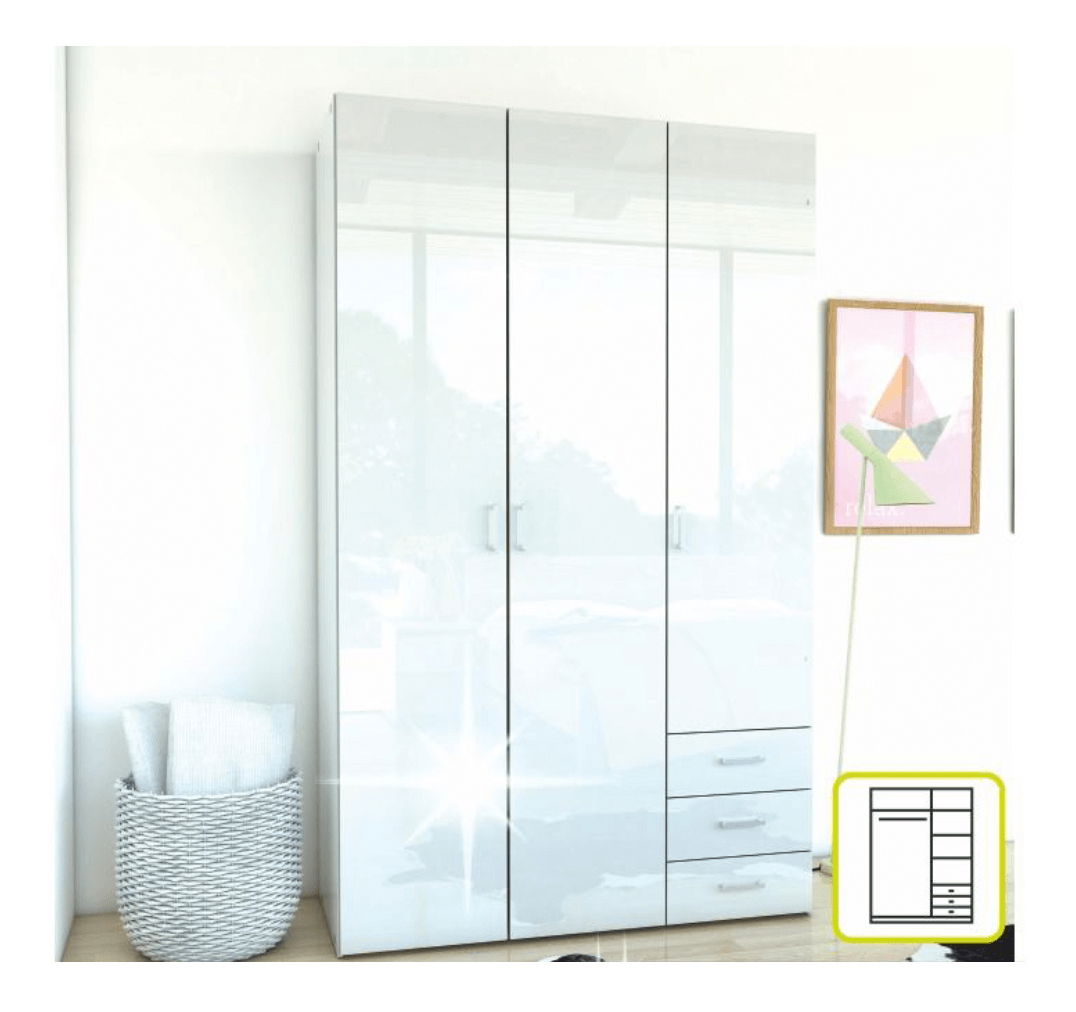 Jednostavan garderobni ormar s tri ladice, dijelom s vješalicom i policama. Elegantnog dizajna u bijeloj boji i visokom sjaju.