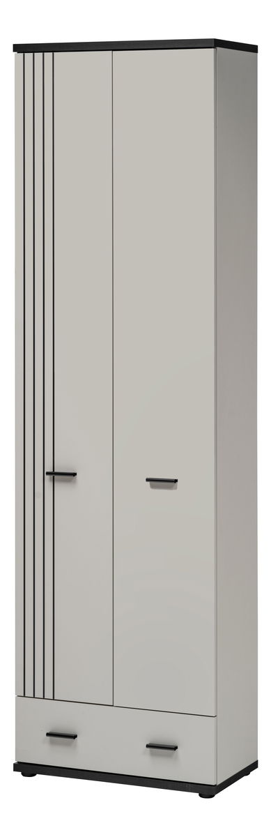 PrikazOrmar za garderobu Hagon s dvokrilnim vratima i praktičnom ladicom u donjem dijelu nudi idealno rješenje za pregledno odlaganje odjeće. Unutarnji raspored osmišljen je s naglaskom na praktičnost – jedna polica u gornjem dijelu, šipka za vješanje haljina ili kaputa te dodatna polica na dnu pružaju dovoljno prostora za svakodnevne i sezonske stvari. Ormar privlači i vizualno – površinu u nijansi kašmira upotpunjuju kontrastni crni detalji i dekorativni otisak pruga koji namještaju daje moderan i elegantan izgled. Savršen izbor za svakoga tko traži stilsko i ujedno praktično rješenje za spavaću sobu, predsoblje ili garderobu.