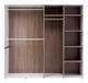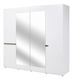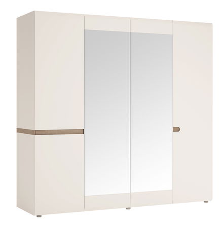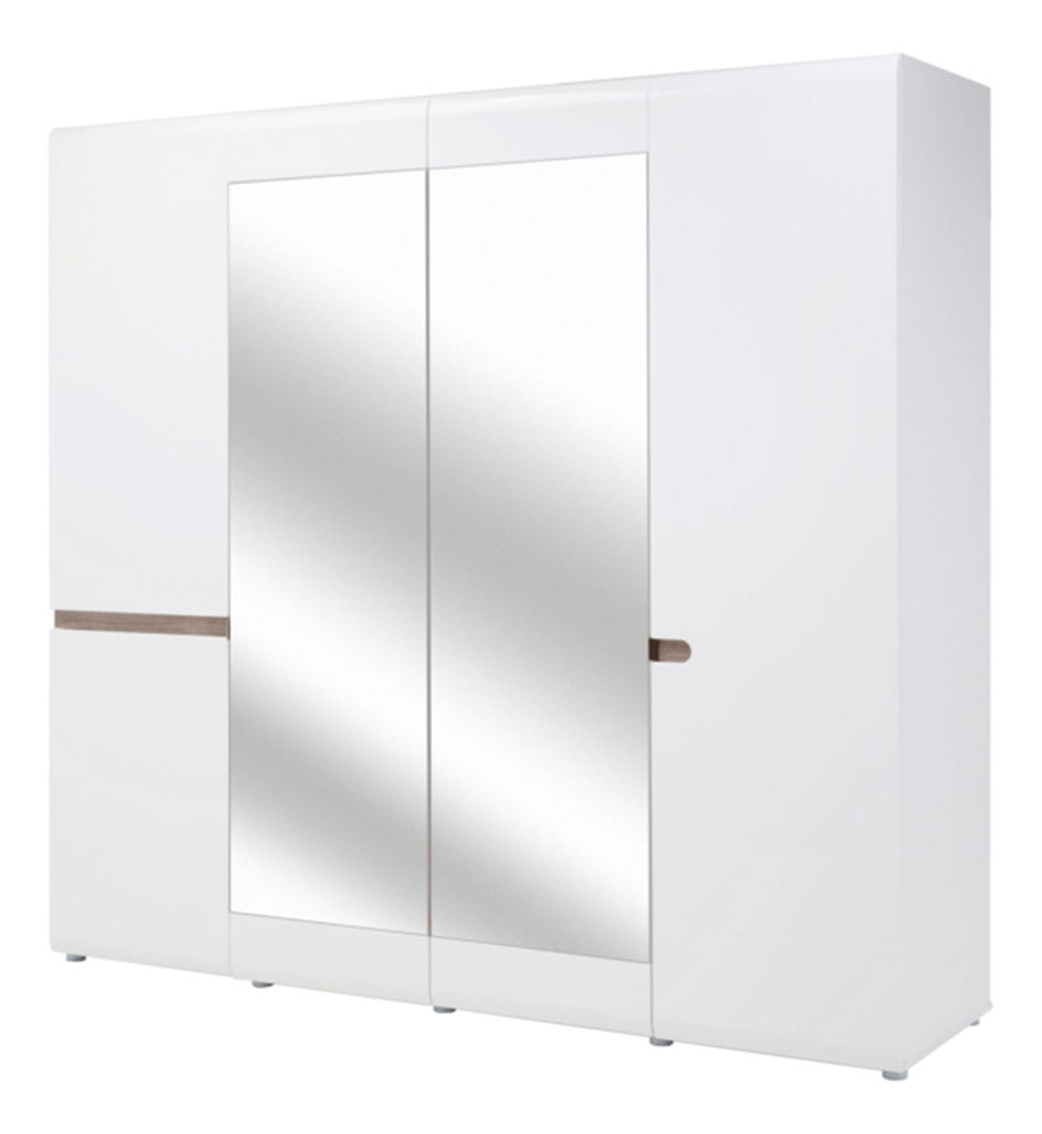 Garderobni ormar Lysander tip 23 s 4 vrata. Srednja vrata imaju ogledalo, a vanjska su u kombinaciji bijela boja + hrast sonoma tartuf. U unutrašnjosti su dvije šipke za vješanje odjeće. Desna polovica je podijeljena na dva dijela.