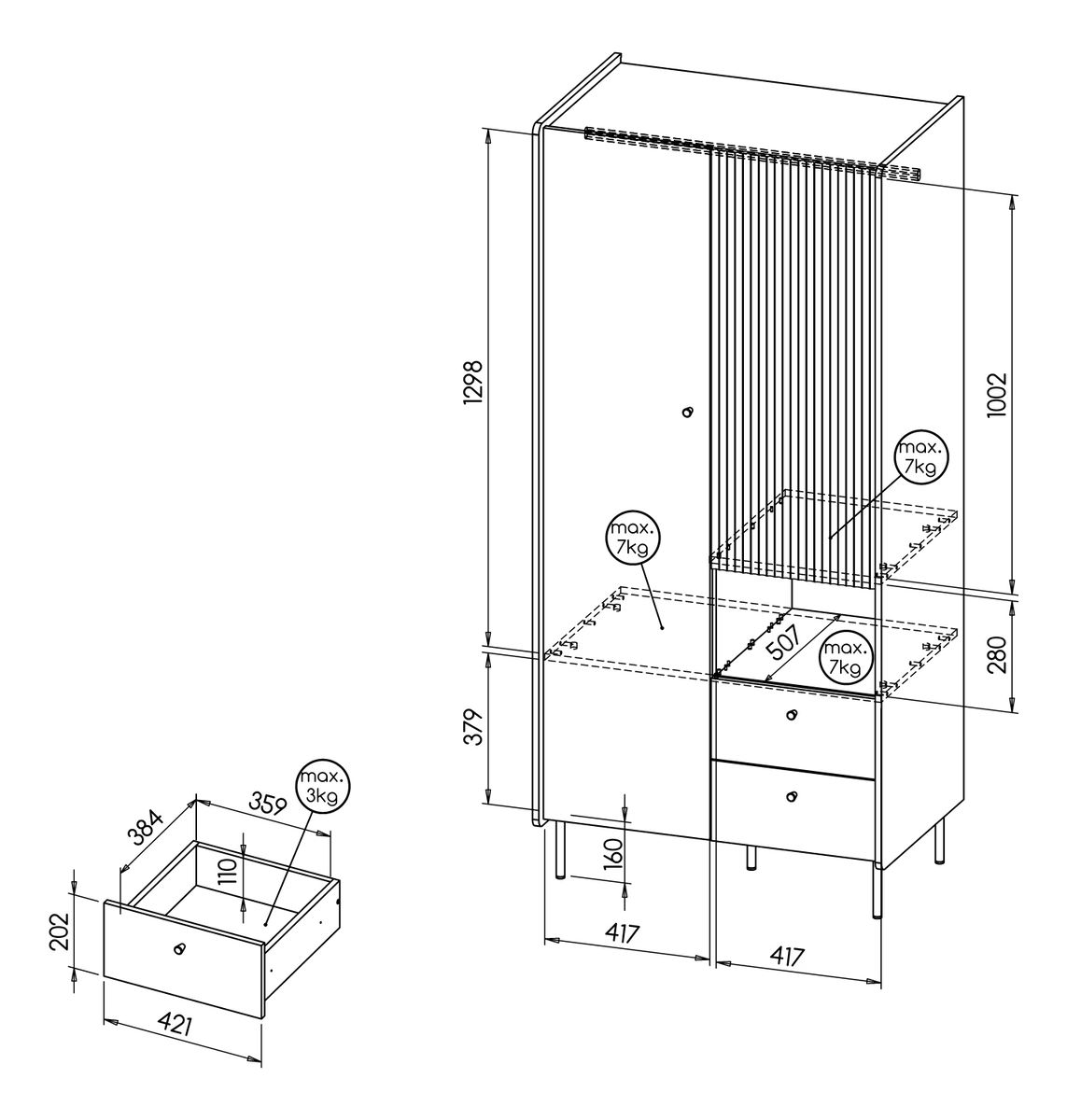 Stražnja strana namještaja i dno ladice izrađeni su od HDF ploče debljine 2,5 mm.