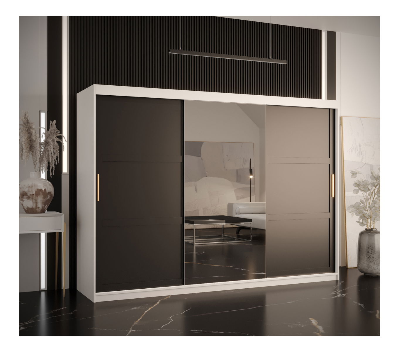 Ormar za garderobu Riven 2 250 (bijela mat + crna mat) (s ogledalom)