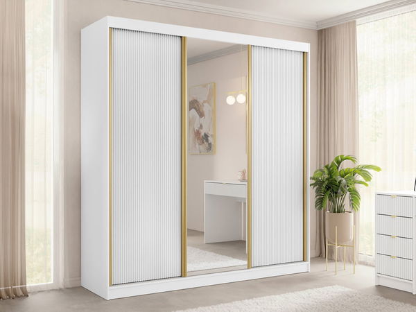 Ormar za garderobu s kliznim vratima idealan je izbor za one koji traže udobnost i stil. Ormar Razimo 3D s kliznim vratima predstavlja moderan dizajn koji će oduševiti ljubitelje trendova. Veliki korpus obogaćen je žljebljenim frontama, ogledalom i zlatnim umetcima. Minimalistički model kombiniran je s daškom prestiža i luksuza. Veliki ormar nudi prostrani prostor za pohranu. Lako ćete u njega smjestiti svu odjeću i modne dodatke. Prostrane police osiguravaju pravilnu organizaciju. Unutrašnjost ormara sadrži i šipku, idealnu za odijela, haljine ili košulje. Funkcionalnost i vizualni dojam dodatno naglašava veliko ogledalo koje osvjetljava i optički povećava prostor. Ogledalo će vam pomoći pri svakodnevnom odabiru stila – pregledat ćete i provjeriti svoj izgled prije izlaska s prijateljima ili na posao. Dimenzije: širina: 200 cm, visina: 216 cm, dubina: 60 cm. Izvedba: korpus: 16 mm laminirana ploča, fronte: 16 mm laminirana ploča + 18 mm MDF ploča, ABS obruba + melamin, stražnja strana od HDF ploče, aluminijske ručke duž vrata u zlatnoj boji, nogice: klizači, sustav kliznih vrata, ogledalo na prednjoj strani, unutrašnjost s policama i šipkom za odjeću. Jamstvo: 24 mjeseca.
