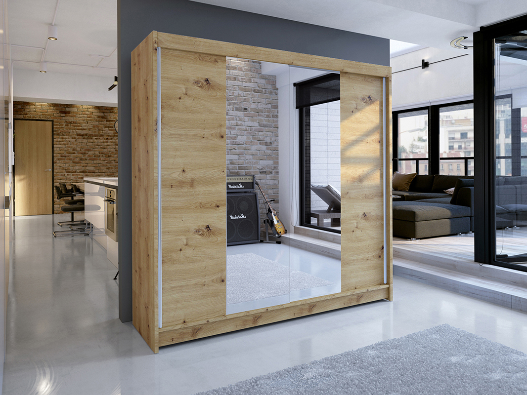 Tražite li ormar za garderobu koji će se istaknuti svojom veličinom i elegantnim dizajnom? Ormar Tatiana je pravi za vas! Dimenzije namještaja su do 215 x 180 x 58 cm, što znači da u ormar možete smjestiti odjeću za svako godišnje doba. Vrata ormara obložena su zrcalima (osim jednog ormara iz asortimana) i iveral s površinskom obradom. br> Unutrašnjost ormara sastoji se od polica i šipki za vješanje. Ormar također ima atraktivnu kombinaciju boja i zanimljivo dizajnersko rješenje. Ova rješenja omogućit će vam stvaranje mirne i skladne atmosfere u prostoriji.