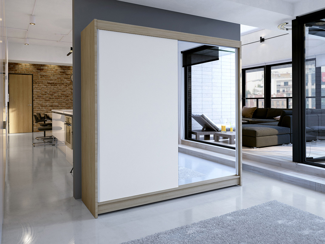 Tražite li ormar za garderobu koji će se istaknuti svojom veličinom i elegantnim dizajnom? Ormar Tatiana je pravi za vas! Dimenzije namještaja su do 215 x 180 x 58 cm, što znači da u ormar možete smjestiti odjeću za svako godišnje doba. Vrata ormara obložena su zrcalima (osim jednog ormara iz asortimana) i iveral s površinskom obradom. br> Unutrašnjost ormara sastoji se od polica i šipki za vješanje. Ormar također ima atraktivnu kombinaciju boja i zanimljivo dizajnersko rješenje. Ova rješenja omogućit će vam stvaranje mirne i skladne atmosfere u prostoriji.