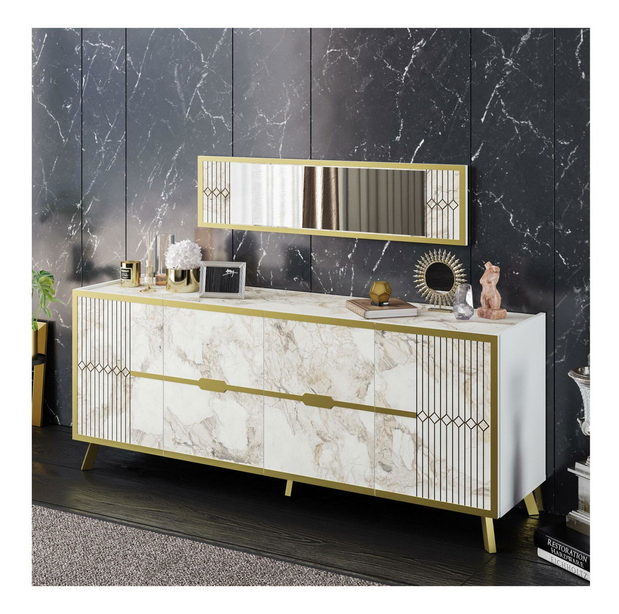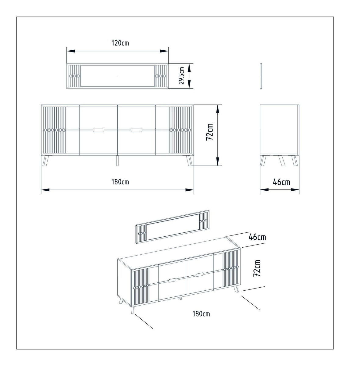 debljina: 18 mm, metalne noge, veličina ogledala: širina: 120 cm, visina: 29,5 cm, veličina konzole: širina: 180 cm, visina: 72 cm, dubina: 46 cm