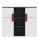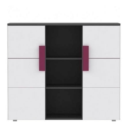 Izrada od folijske ploče iverice. Korpus je sive boje, fronte (vrata i ladice) su bijele boje, a ručke ljubičaste boje.